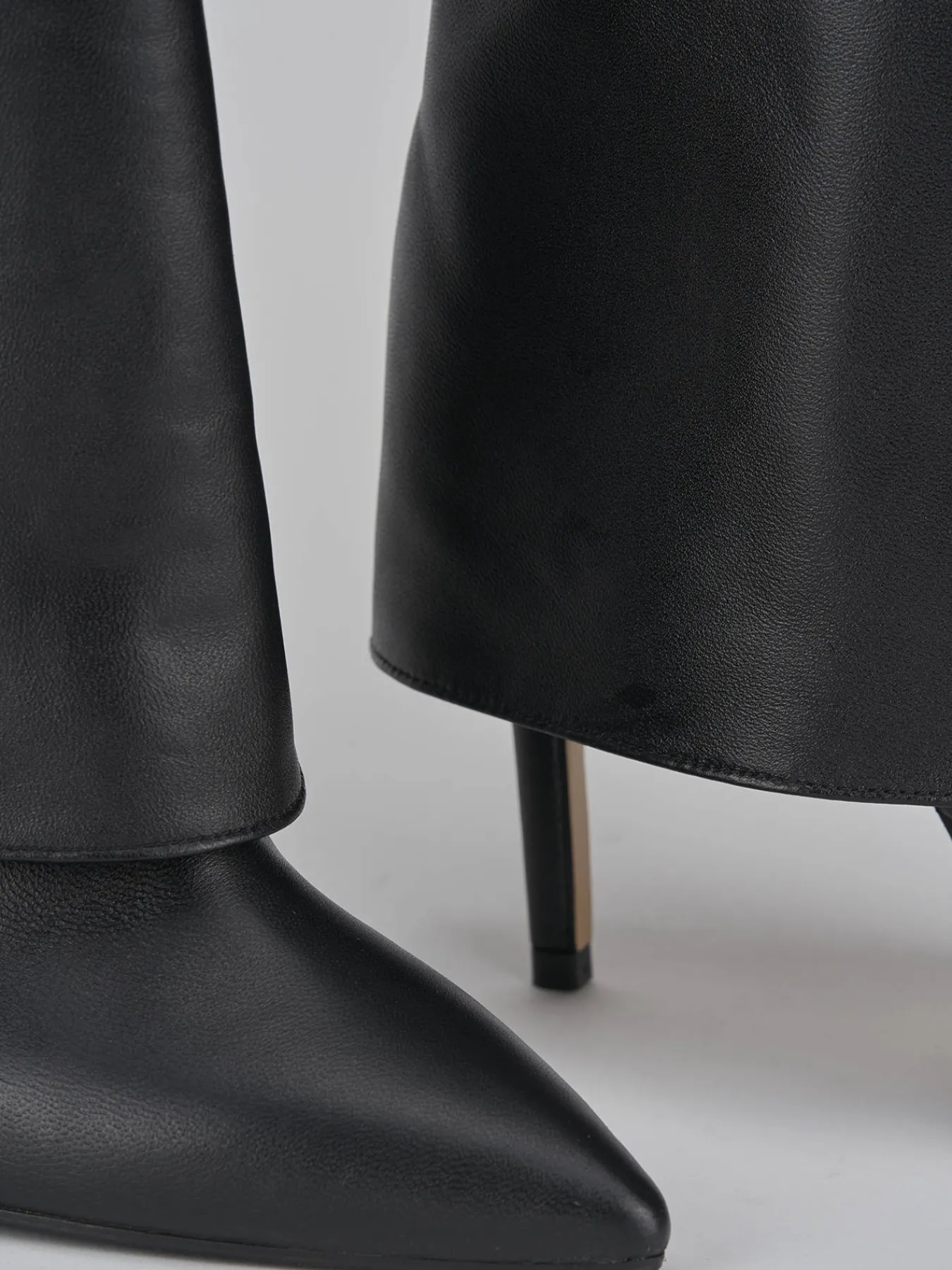 Stivale tacco 11 cm fondo in cuoio con inserto di gomma in punta e soletto interno in vera pelle. Tomaia in morbida pelle, punta sfilata, ampio gambale con risvolto che arriva appena sotto al ginocchio e tacco a spillo per un look chic.