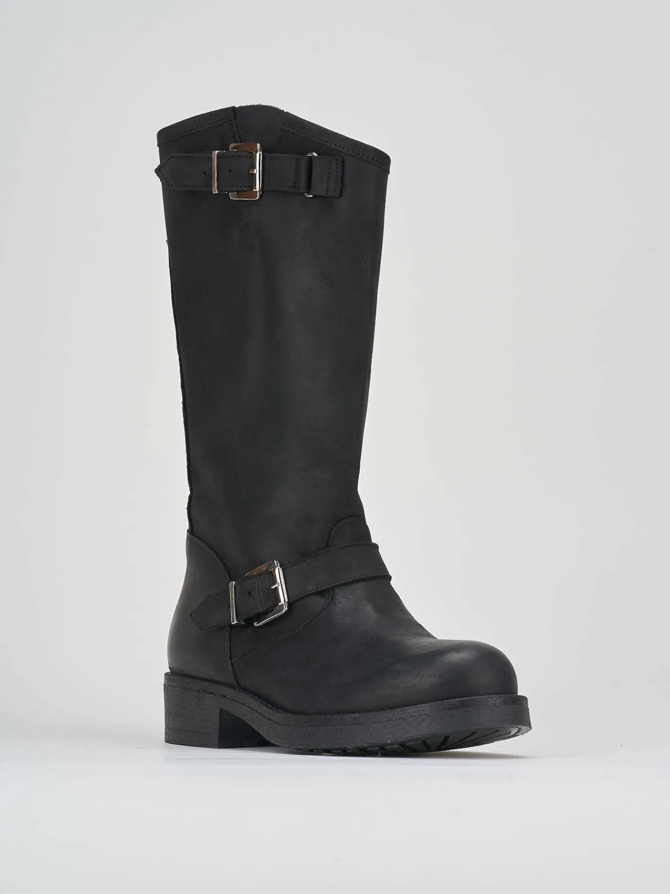 Realizzati in vitello nabuk spazzolato anticato, questi stivali presentano una doppia fibbia decorativa che richiama il classico stile biker.
