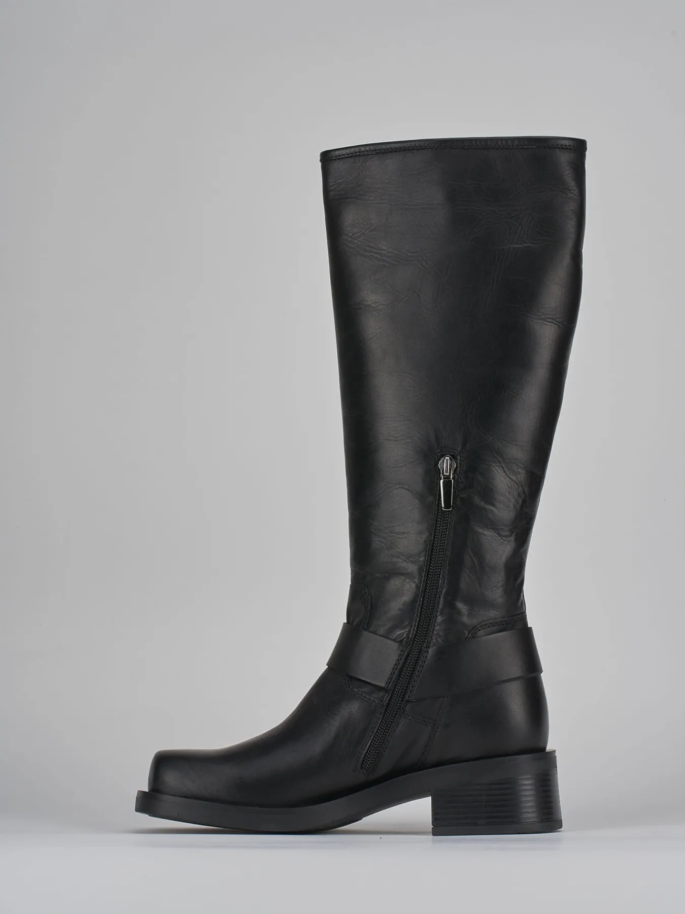 Stivale biker tacco 3 cm fondo in gomma e soletto interno in vera pelle. Tomaia in morbida pelle, punta squadrata, fascia attorno alla caviglia con anello in metallo, altezza gambale fino a sotto il ginocchio con cerniera laterale e fibbia regolabile in cima. comodo tacco per un look biker estremamente cool.