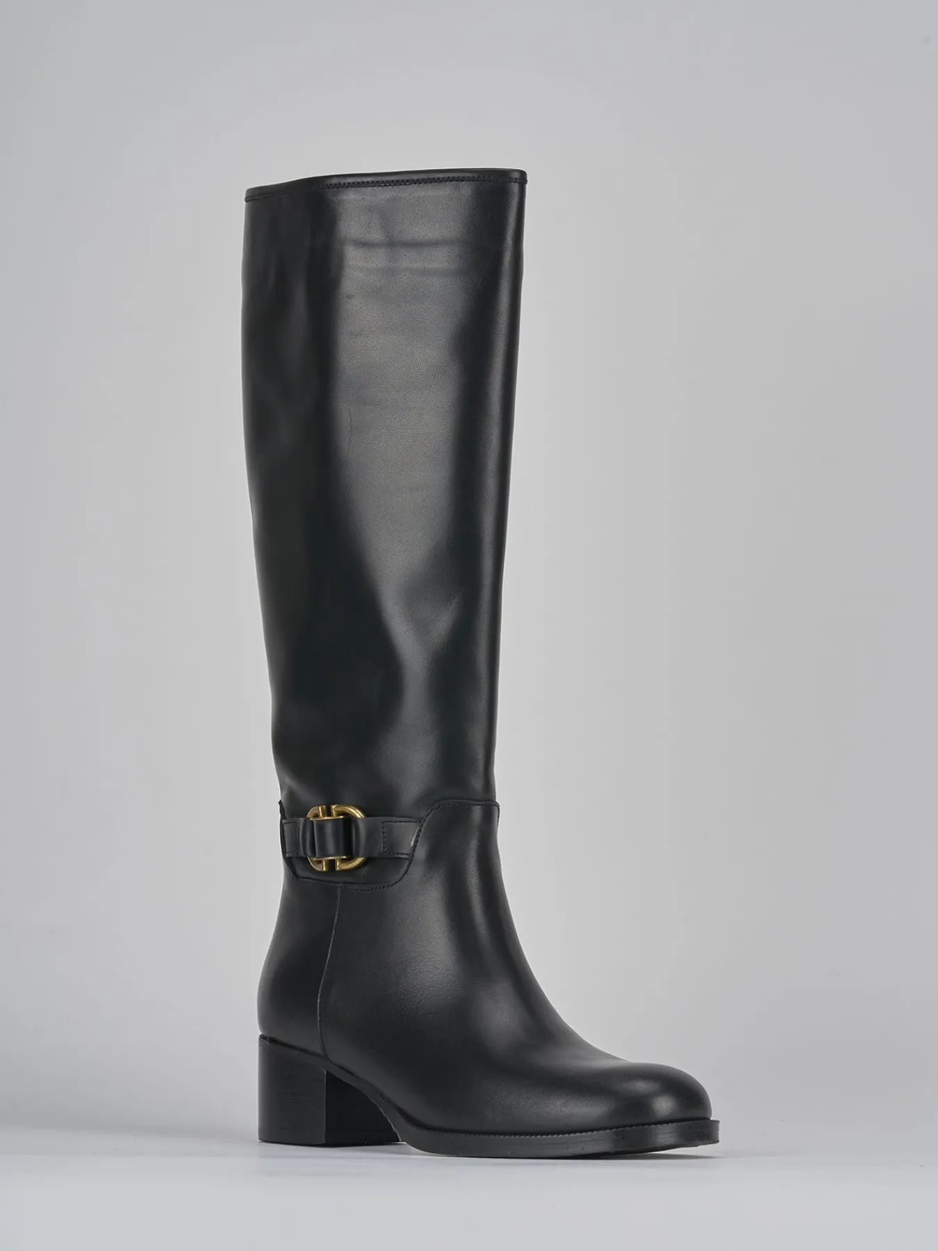Stivale tacco 4 cm fondo in gomma e soletto interno in vera pelle. Tomaia in morbida pelle, punta squadrata, cerniera laterale, accessorio in caviglia, gambale tubolare ampio che misura appena sotto il ginocchio, tacco grosso per un look estremamente versatile per tutti i giorni.