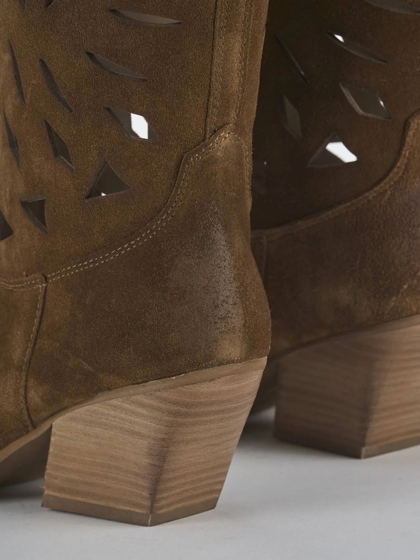 Stivale texano tacco 6 cm fondo in gomma e soletto interno in vera pelle. Tomaia in morbida pelle scamosciata, punta sfilata, gambale laserato che misura appena sotto il ginocchio, ghette e tacco cubano. Guardolo appena sporgente. Perfetto per un look che ti farà notare.