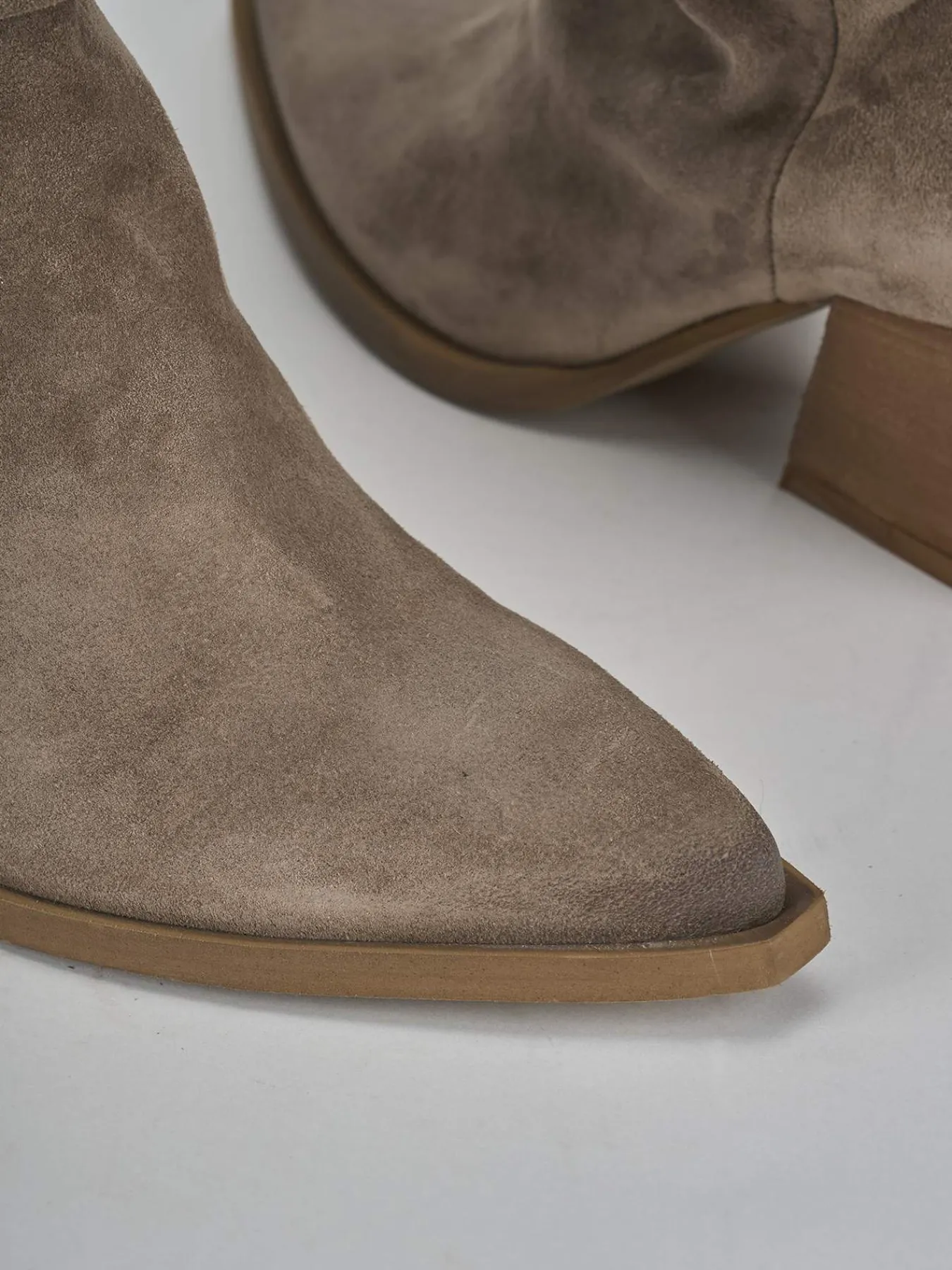 Stivale texano tacco 6 cm fondo in gomma e soletto interno in vera pelle. Tomaia in morbida pelle scamosciata, punta sfilata, cuciture a mano sul gambale che misura appena sotto il ginocchio. Tomaia arricciata, aprtura savasata frontalmente e tacco cubano per un look cool.