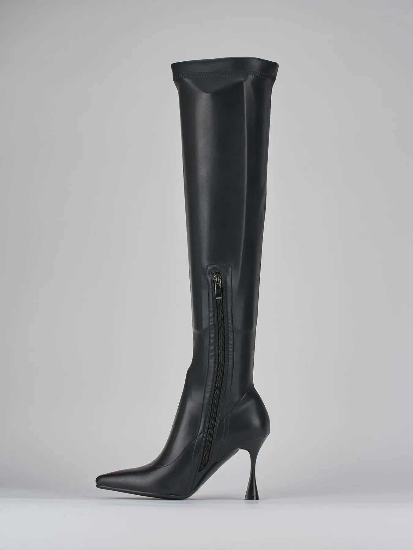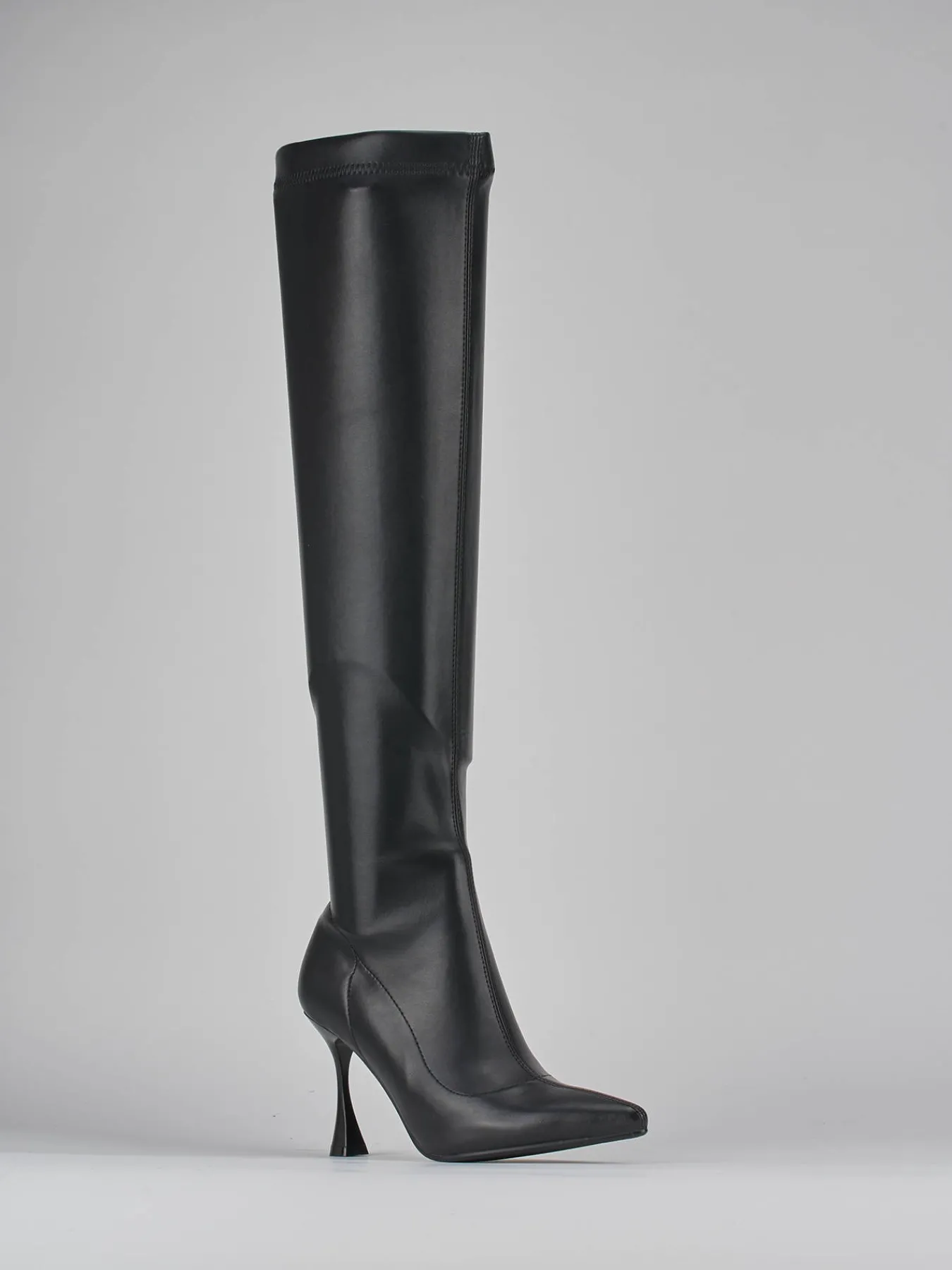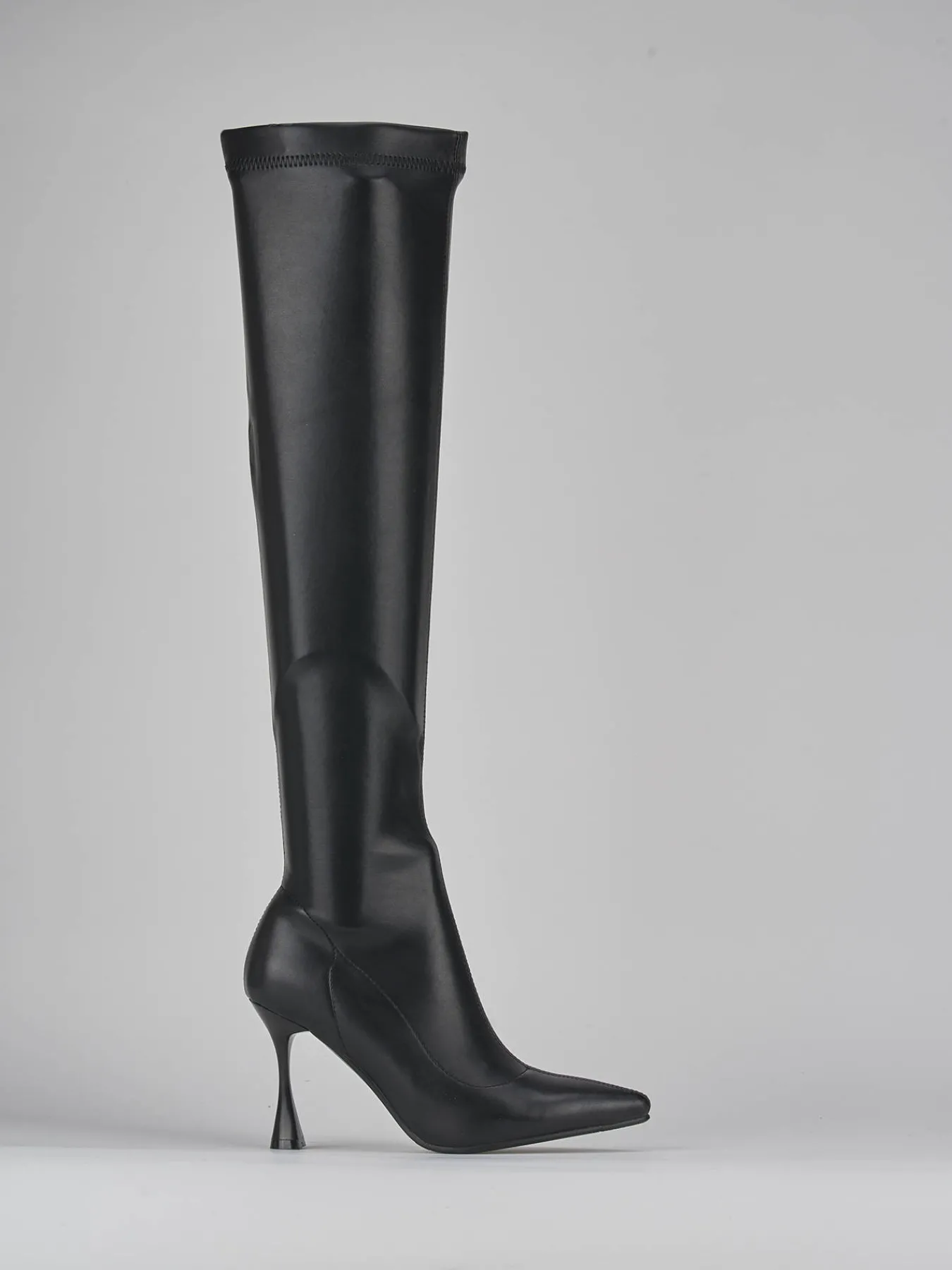 Stivale tacco 8 cm fondo in leggera gomma e soletto interno in vera pelle. Tomaia in pelle elasticizzata, punta sfilata, cuciture visibili, gambale elasticizzato aderente fino a sopra l’altezza del ginocchio, e moderno tacco a rocchetto per un look contemporaneo.