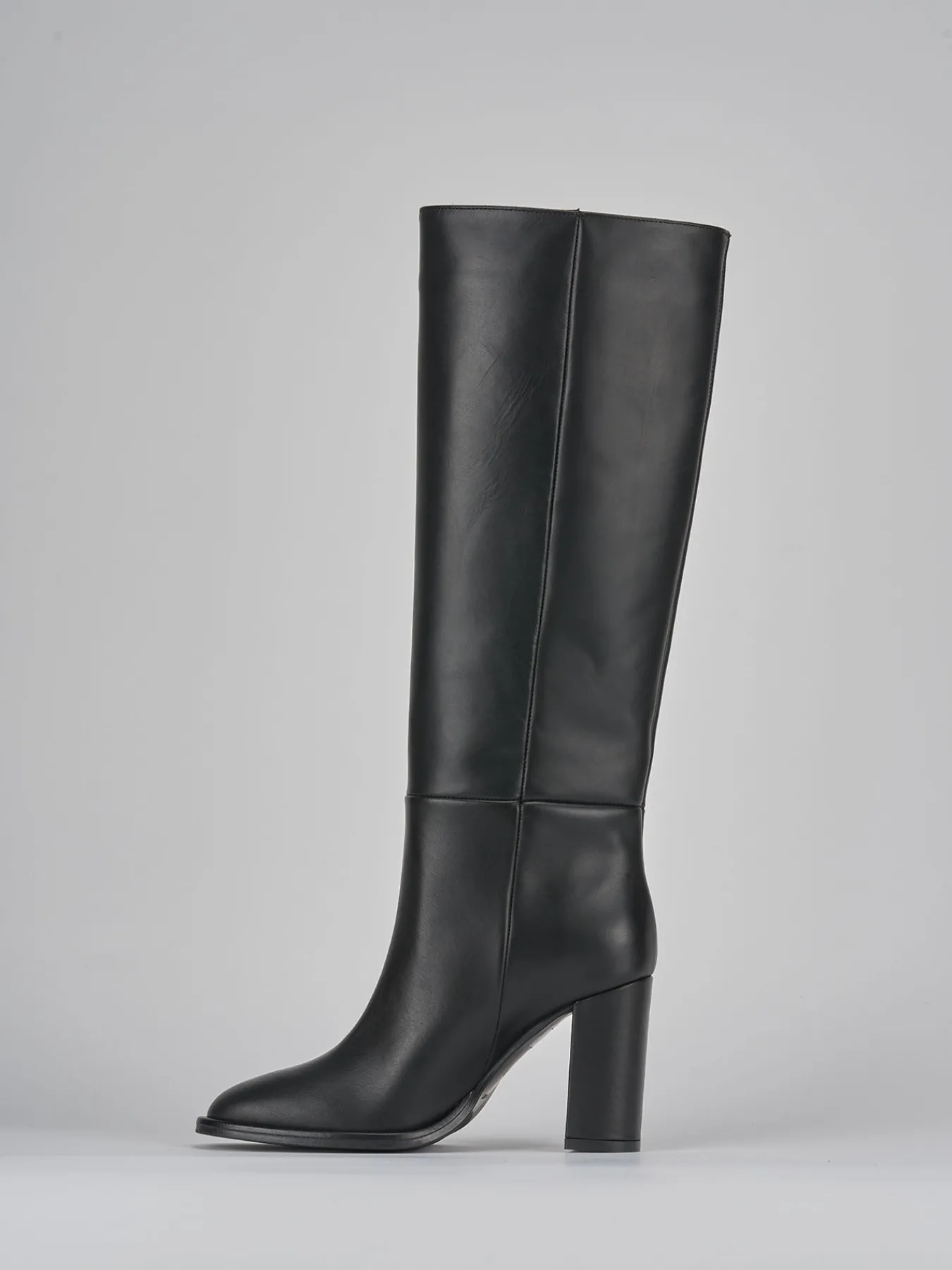 stivale tacco 9 cm fondo in gomma e soletto interno in vera pelle. tomaia in morbida pelle, punta affusolata, guardolo sporgente, altezza gambale appena sotto il ginocchio e tubolare. Tacco grosso per una camminata perfetta.