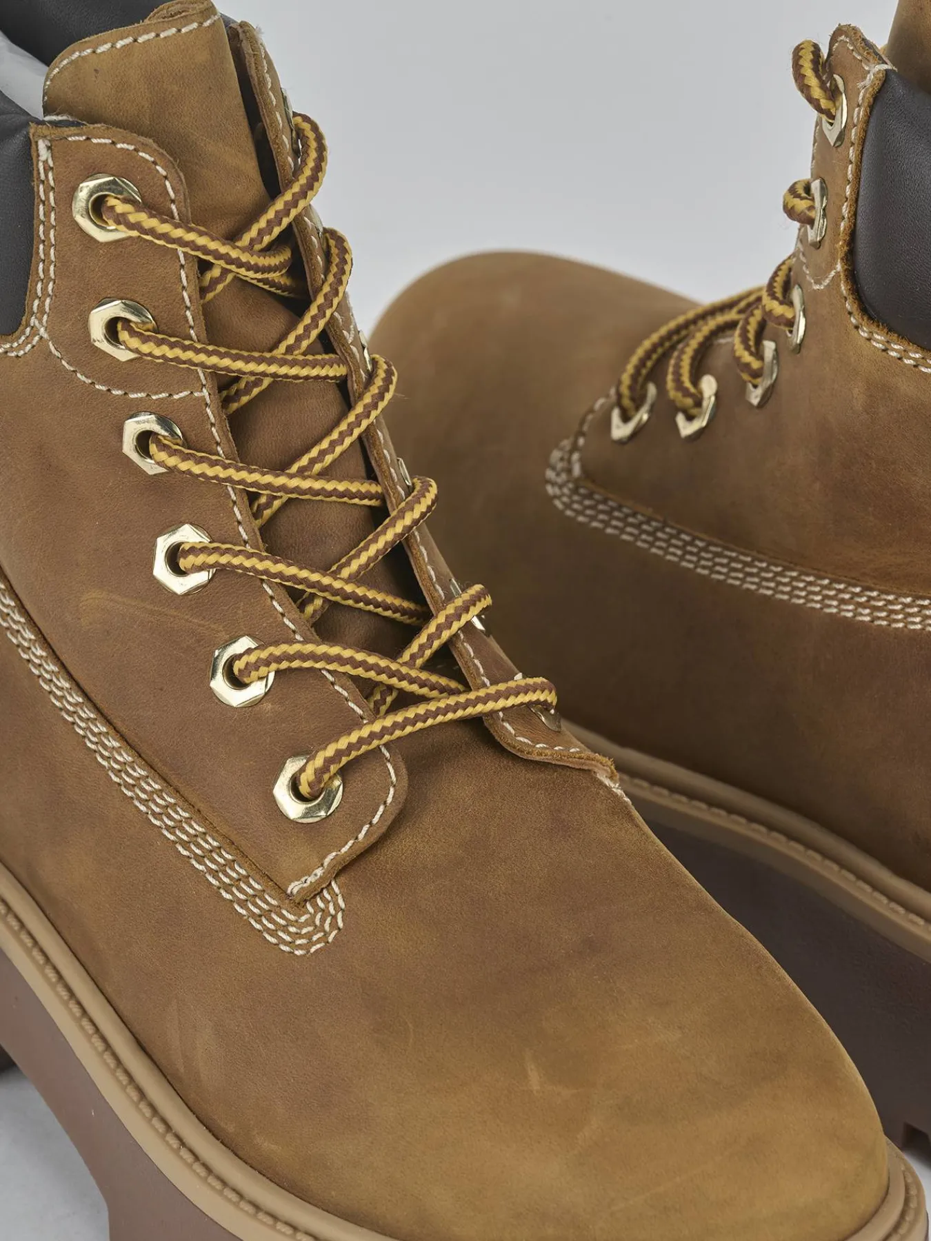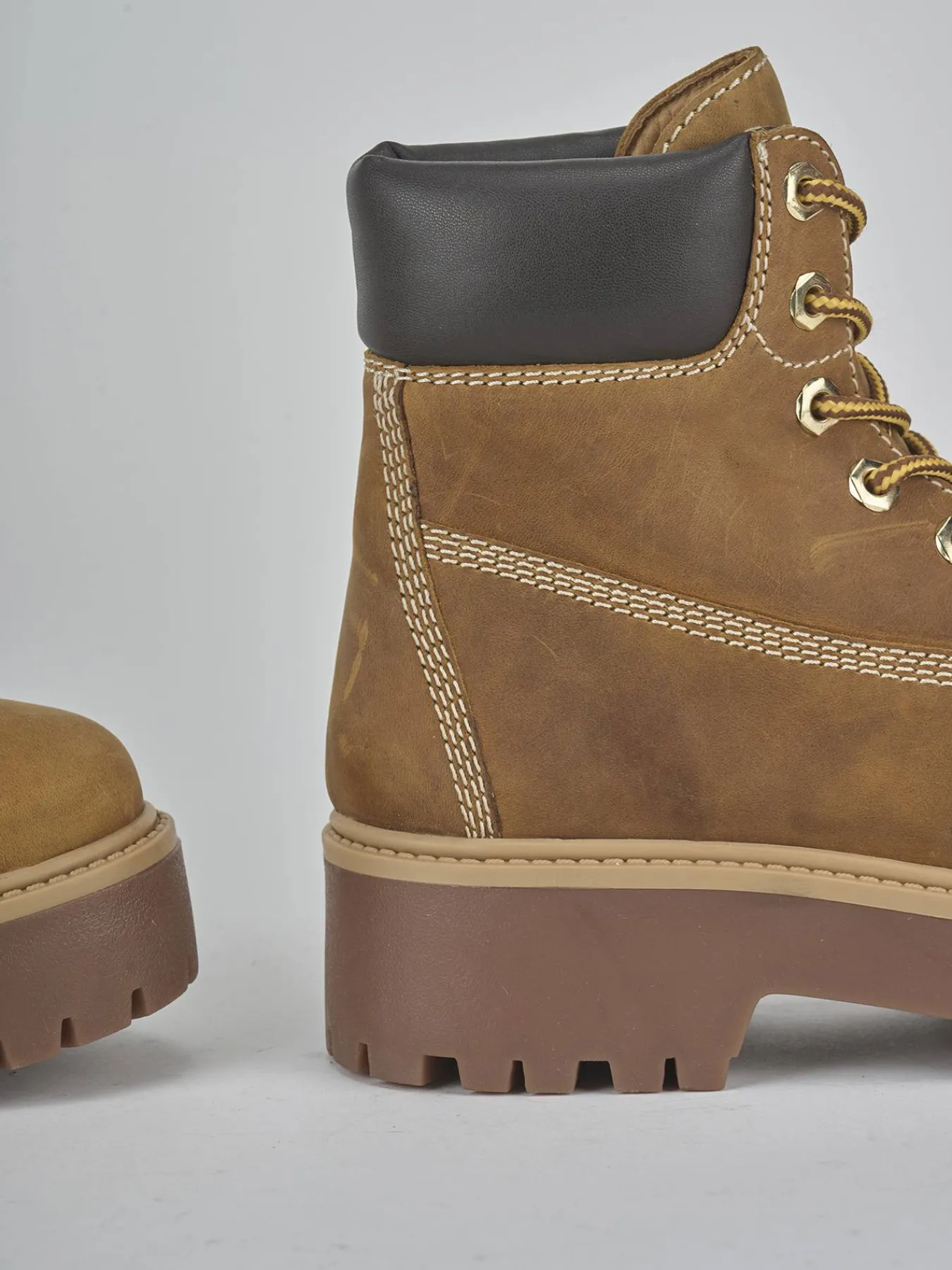 Le cuciture visibili aggiungono un dettaglio artigianale, mentre gli occhielli in metallo e il lace completano il design classico.