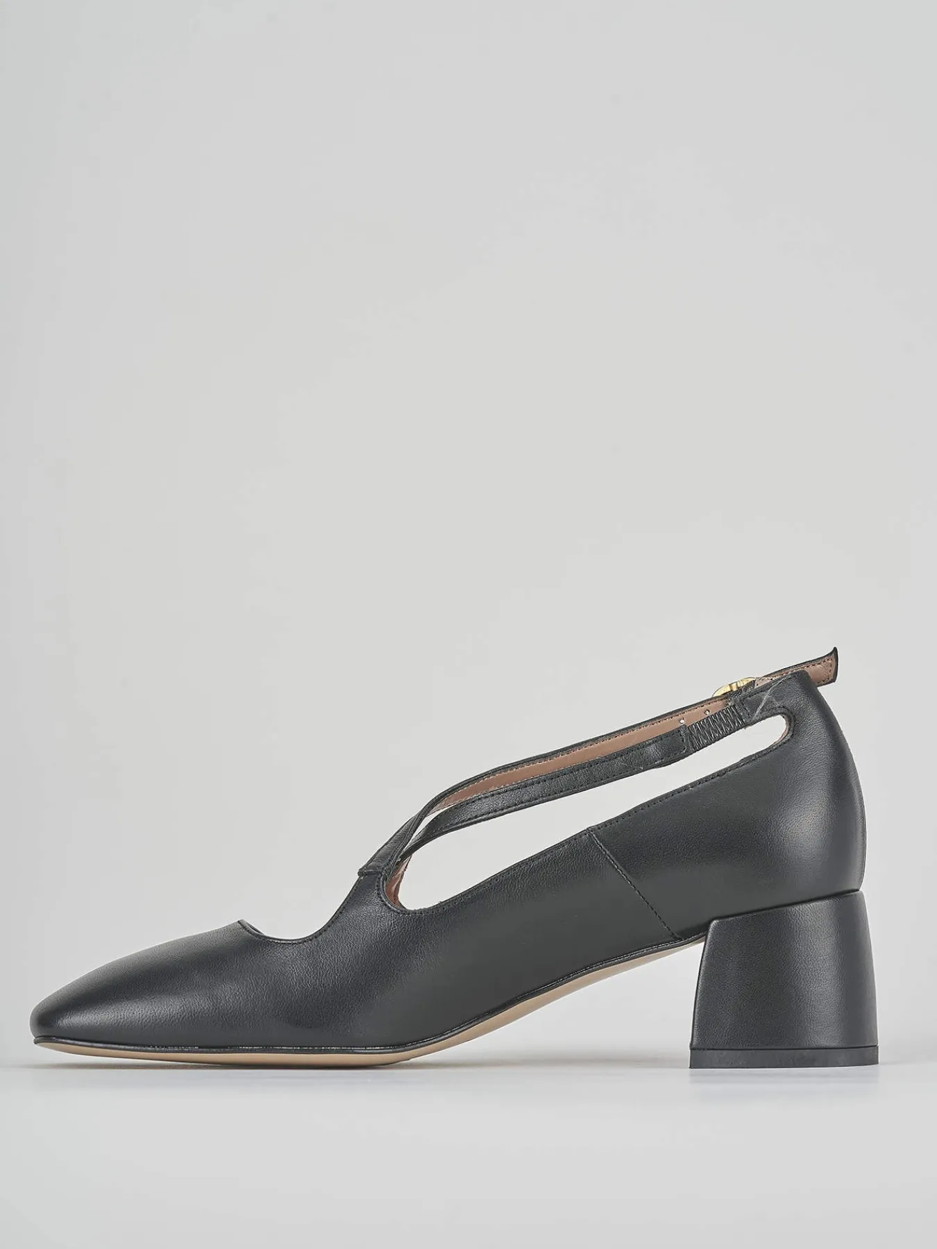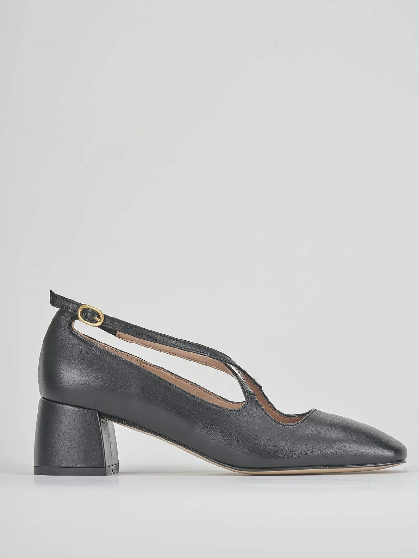 Bebè tacco 5 cm, fondo in cuoio e soletto interno in vera pelle. Tomaia in morbida pelle nappata, punta squadrata, cinturini che si incrociano sul collo del piede, chiusura a fibbia regolabile e tacco grosso per una calzata più comoda, adatto con un vestito per un look elegante.