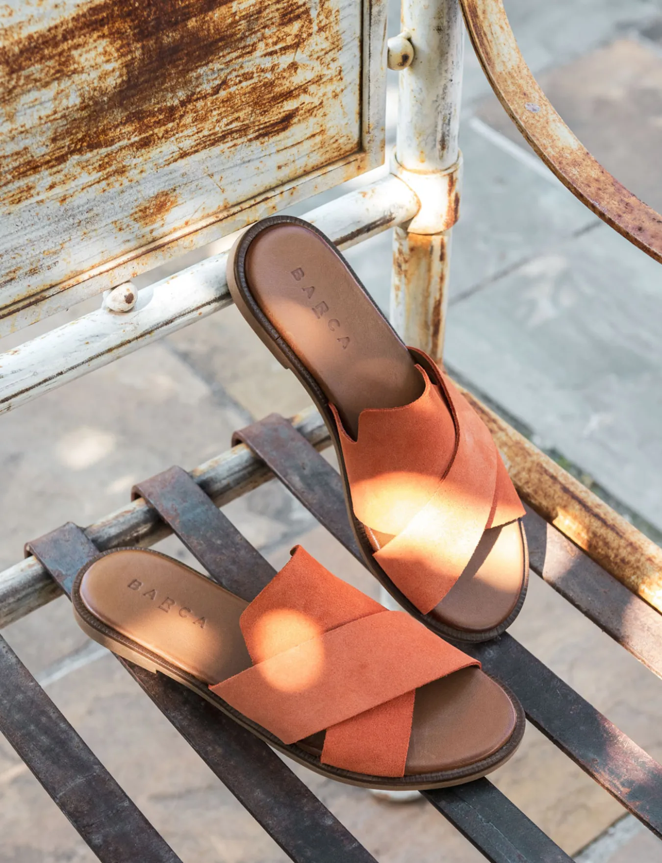 La tomaia in morbido camoscio arancio avvolge il piede con un design affusolato e sofisticato.