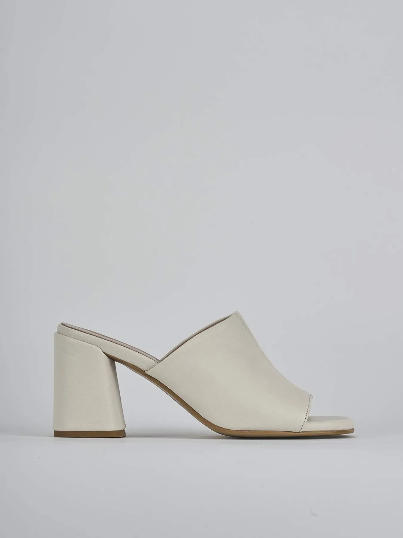 Ciabatta tacco 7 cm fondo in leggerissima gomma e soletto interno in vera pelle. Tomaia in morbida pelle, punta leggermente squadrata, fascia unica con cuciture a vista a mano e tacco grosso. Perfetto per la tua estate italiana.