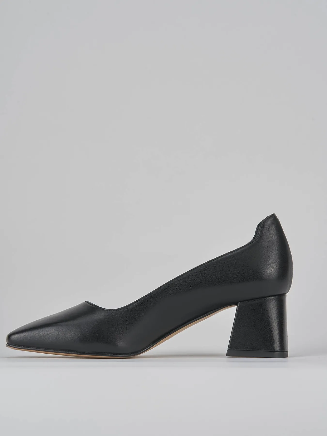 Decoltè tacco 5 cm fondo cuoio e soletto interno in vera pelle. Tomaia in morbida pelle nappata, punta squadrata, apertura squadrata sulla punta del piede, tallone leggermente più alto che protegge e tacco grosso per un look cool.
