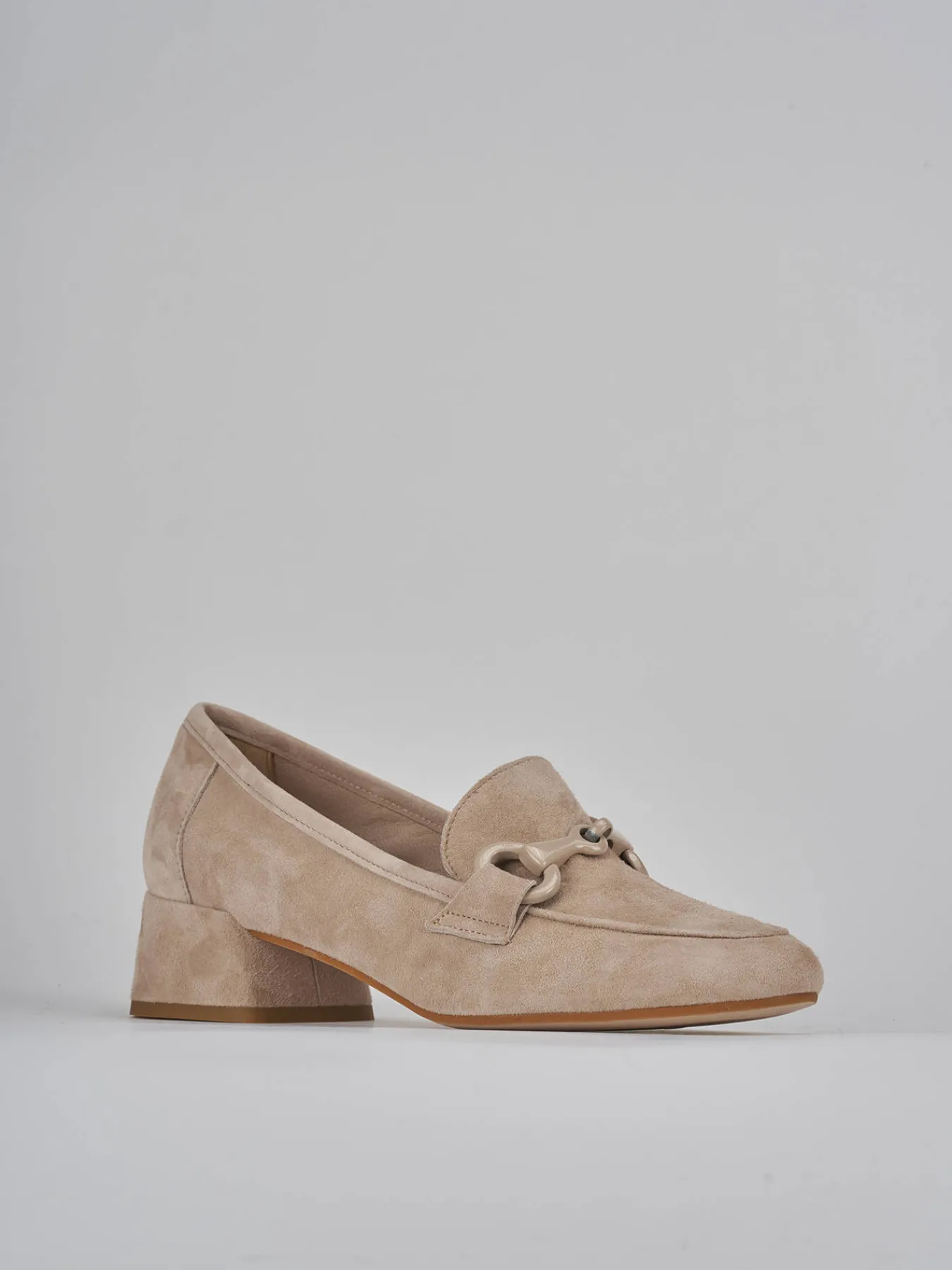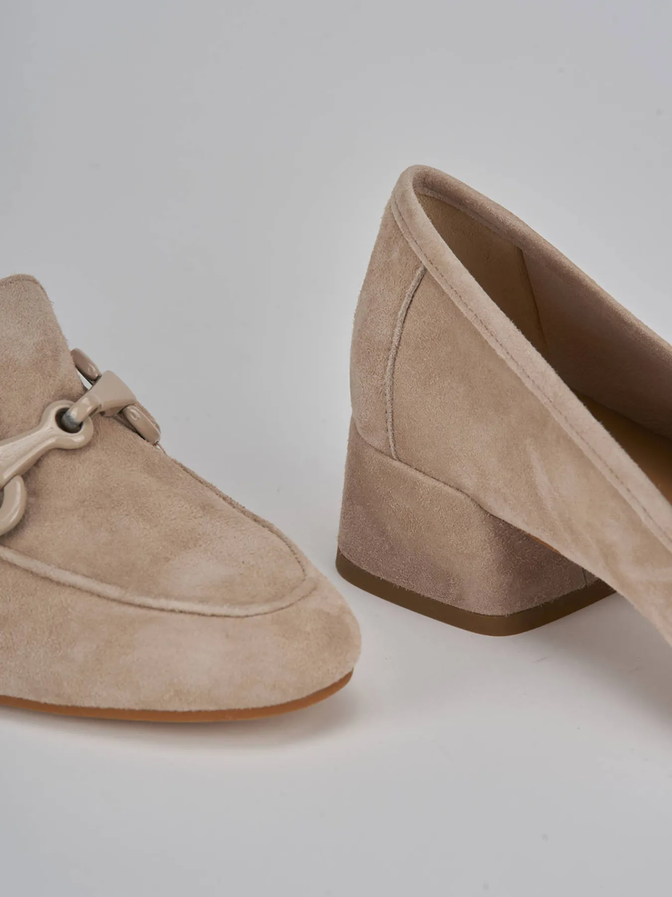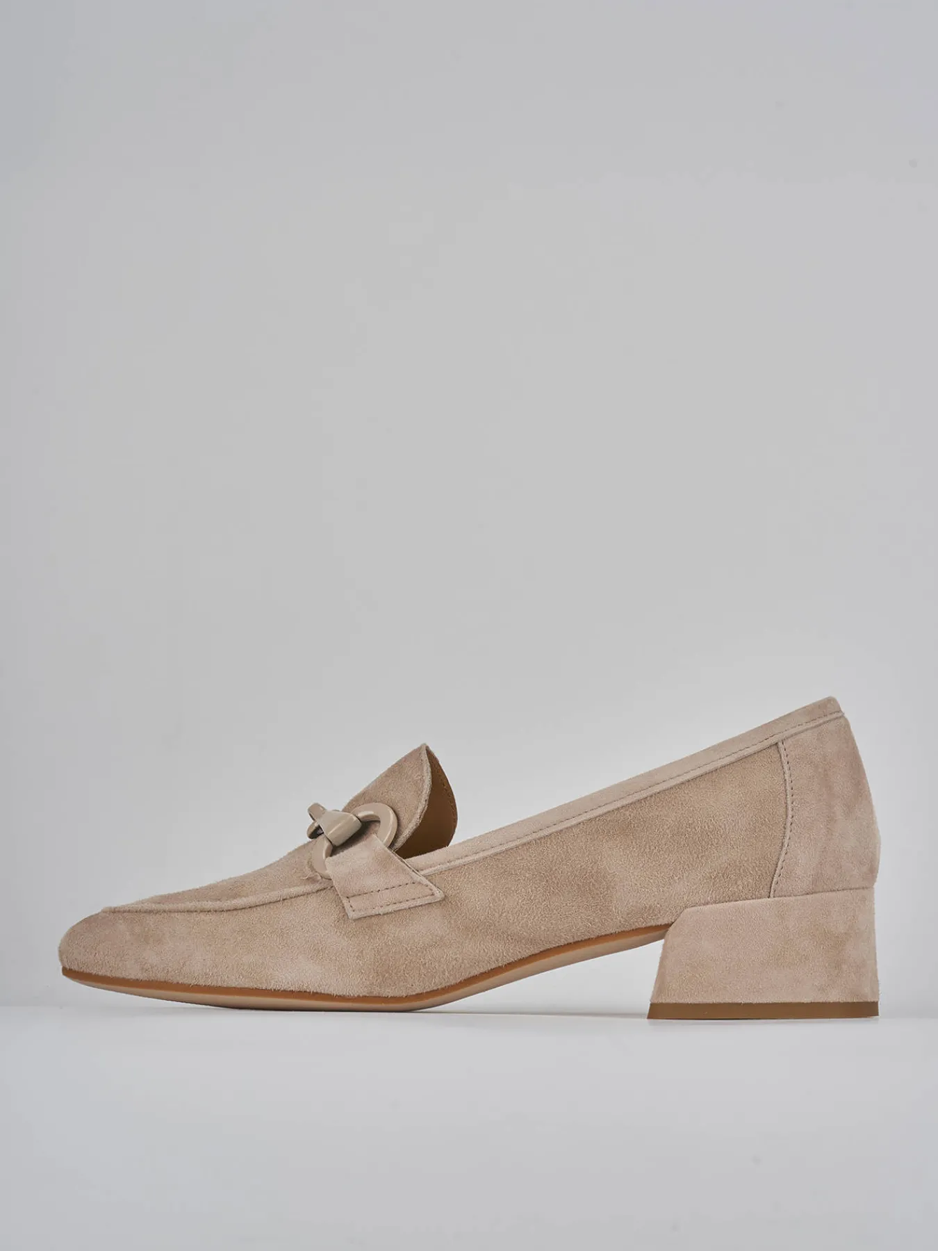 Mocassino tacco 3 cm fondo in cuoio e soletto interno in vera pelle. tomaia in morbido camoscio, punta affusolata, cuciture in rilievo, morsetto in tinta e tacco grosso stabile. Con un design che ti accompagnerà nel tempo.