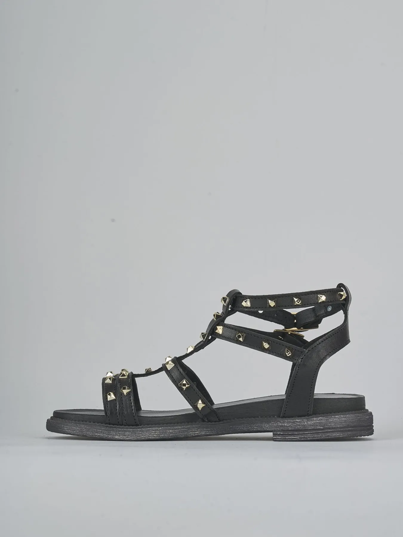 Sandalo tacco 2 cm fondo in leggerissima gomma e soletto interno in vera pelle. Tomaia in morbida pelle, punta affusolata, fasce, borchie e due cinturini con fibbia regolabile per un look perfetto per la tua estate. Soletto interno imbottito per una calzata supersoft.