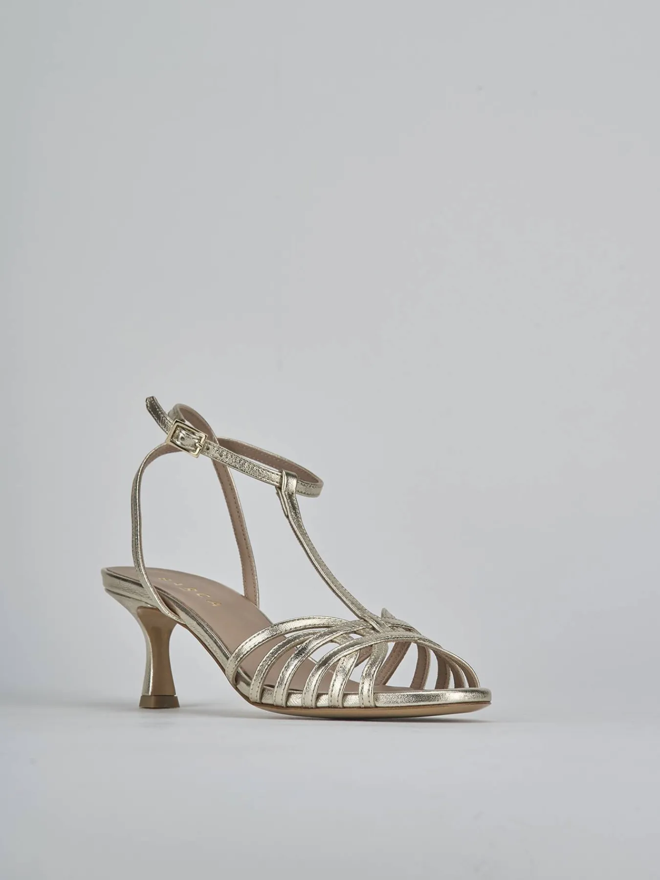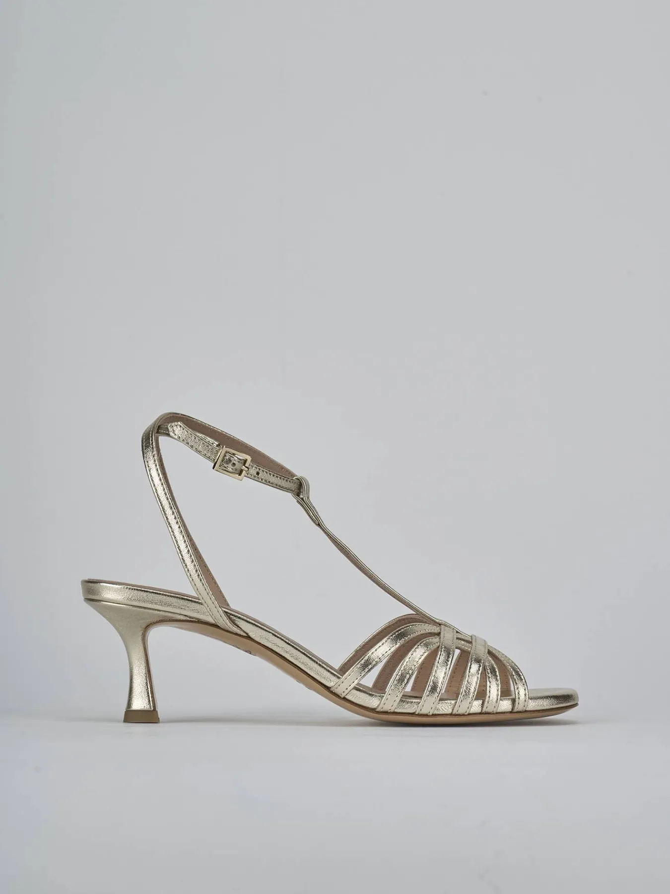 Sandalo tacco 5 cm fondo in cuoio e soletto interno in vera pelle. Tomaia in morbida pelle laminata, punta affusolata, fascette a incastro davanti e a ‘T’ con cinturino in caviglia con fibbia regolabile e tacco cool. Perfette sia con un vestito leggero che con dei jeans.
