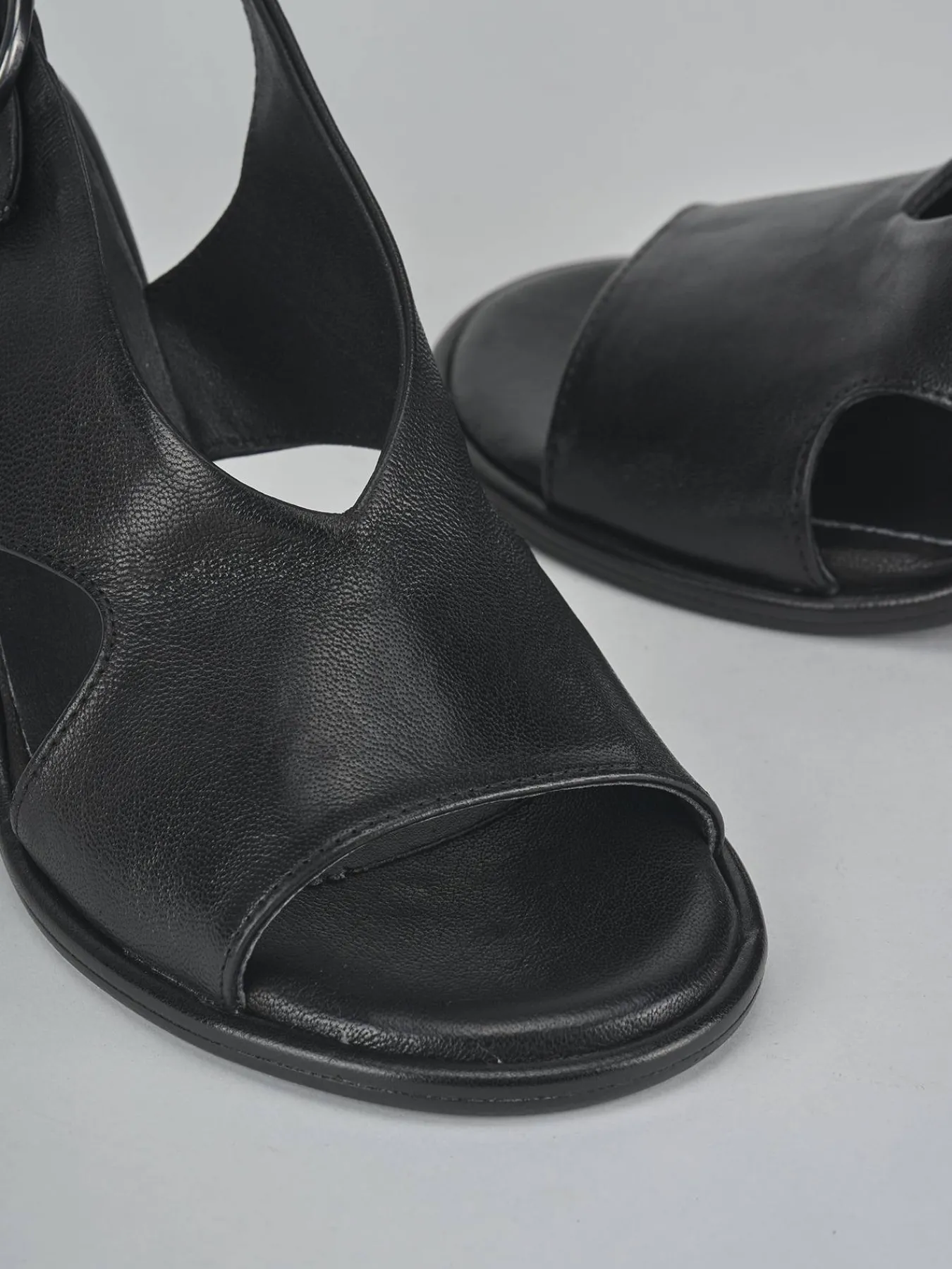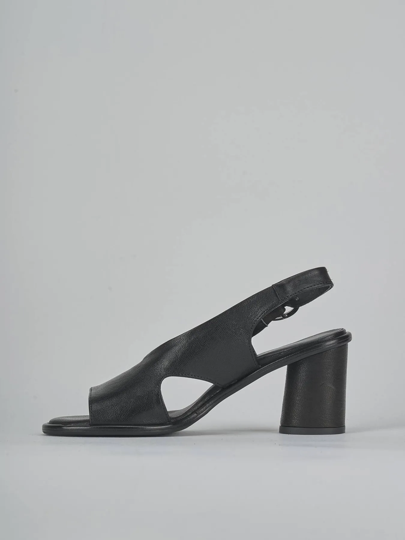 Sandalo tacco 6 cm fondo in cuoio e soletto interno in vera pelle. Tomaia in morbida pelle, punta tonda, cinturino con fibbia regolabile che avvolge bene il tallone e tacco a cono. Versatile sia con un vestito che con un paio di bermuda.