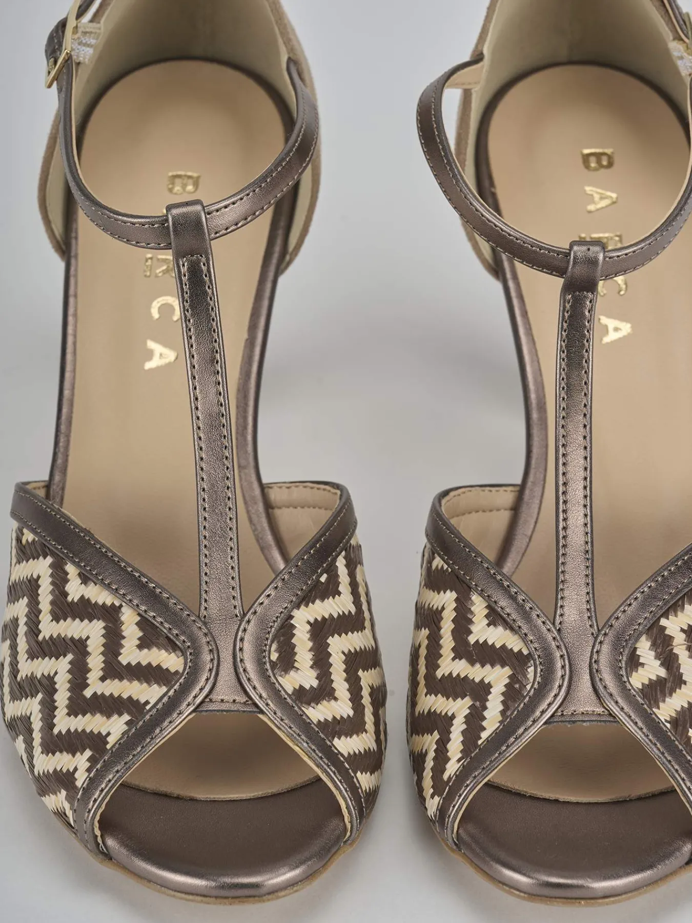 Sandalo tacco 7 cm fondo in leggerissima gomma e soletto interno in vera pelle. Tomaia in morbida pelle foderata con intrecciatura effetto rafia, punta affusolata, cinturino a ‘T’ con fibbia regolabile e tacco grosso. Perfetto con una gonna e una maglia.