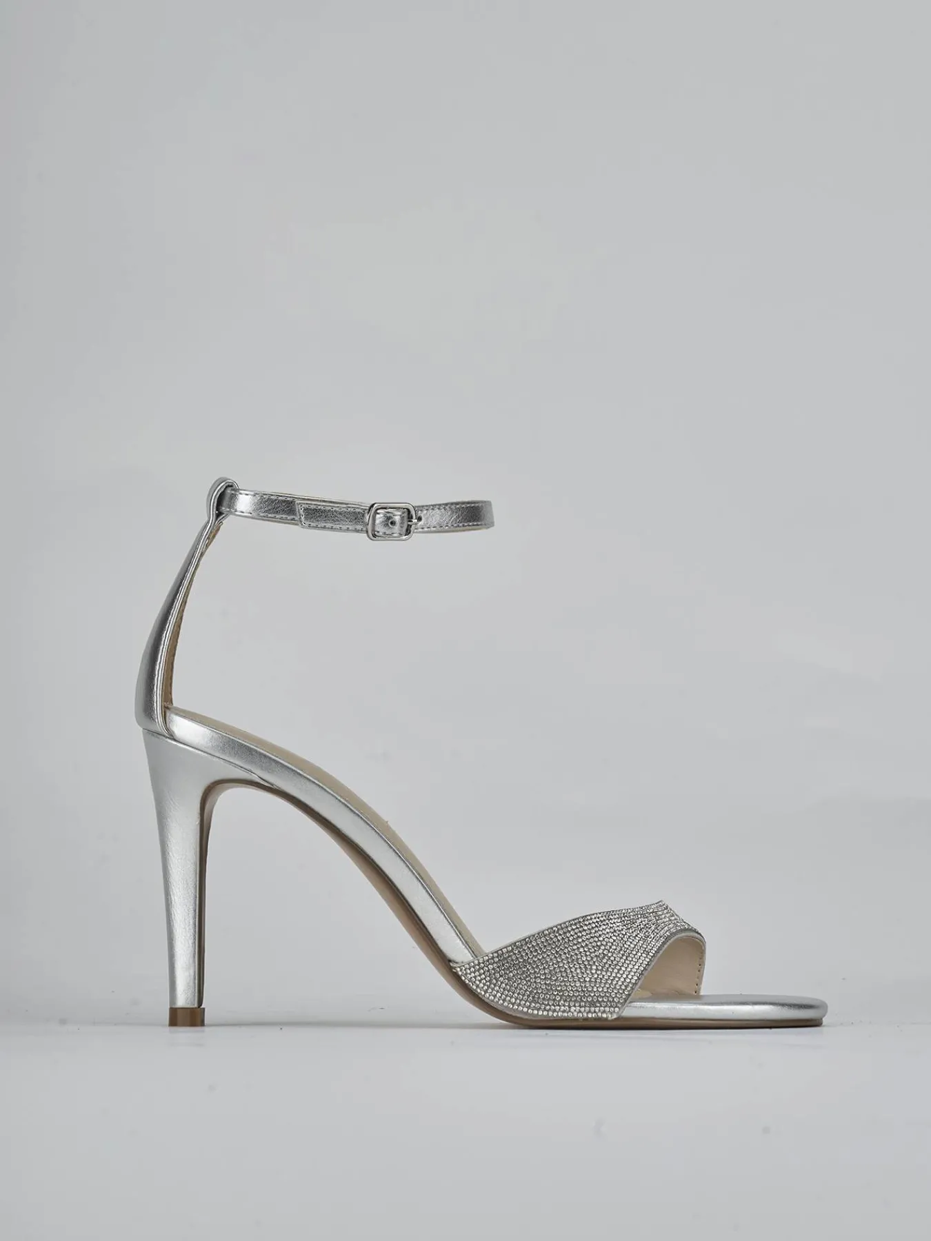 Sandalo tacco 8 cm fondo in gomma e soletto interno in vera pelle. Tomaia in morbida pelle, punta affusolata, fascia unica con tagliio geometrico, brillantini, cinturino con fibbia regolabile e tacco fino per un tocco chic ai tuoi look.
