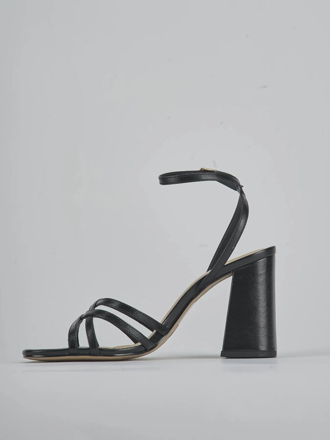 Sandalo tacco 8 cm fondo in leggerissima gomma e soletto interno in vera pelle. Tomaia in morbida pelle, punta leggermente squadrata, fascette incrociate, cinturino incrociato con fibbia regolabile e tacco grosso per un look chic.