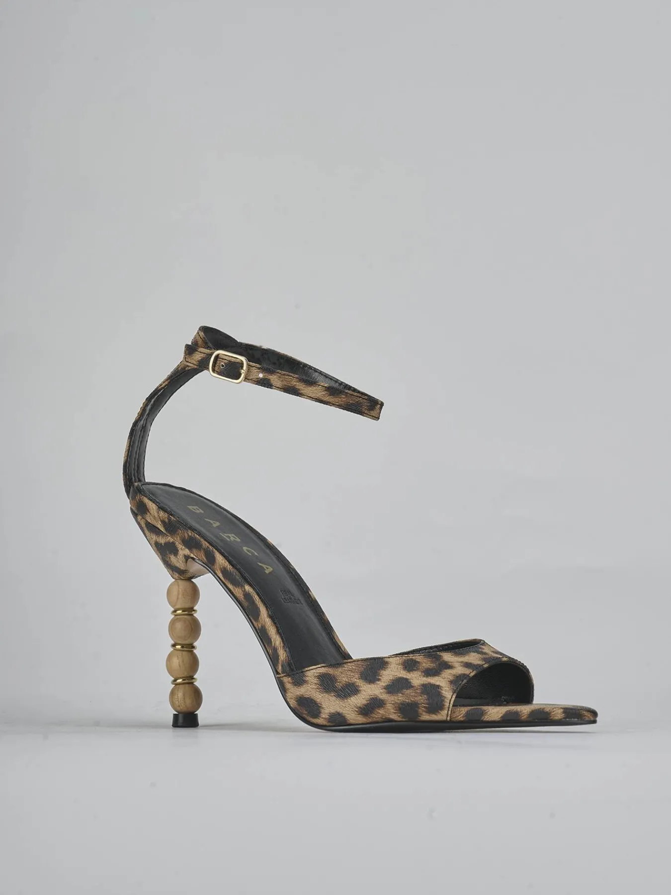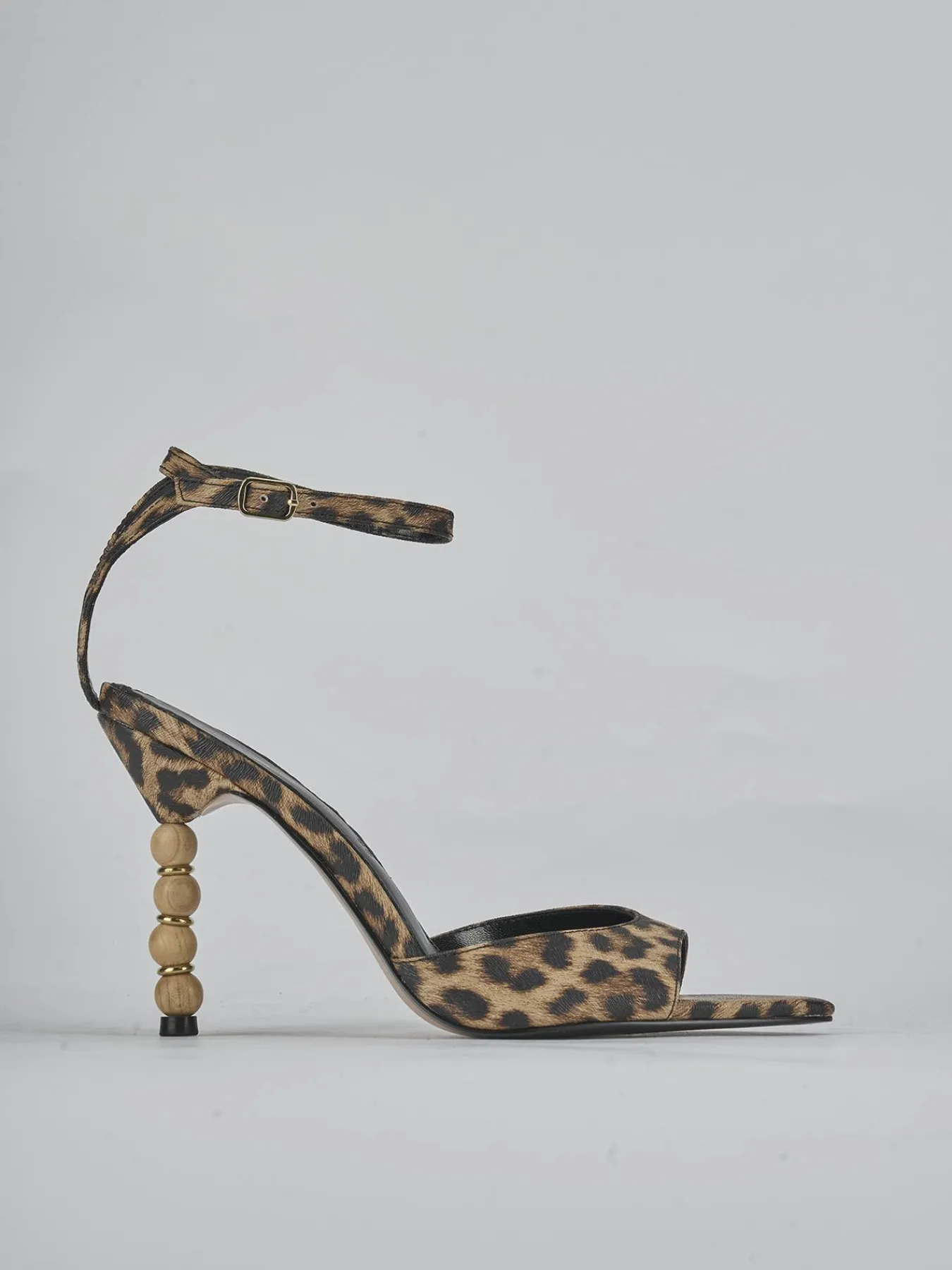 Sandalo tacco 8 cm fondo in leggera gomma e soletto interno in vera pelle. Tomaia in morbida pelle stampata leorpardo, punta sfilata, fascia con taglio geometrico, cinturino in caviglia con fibbia regolabile e tacco particolare con strass e perle. Per un look che ti farà notare.