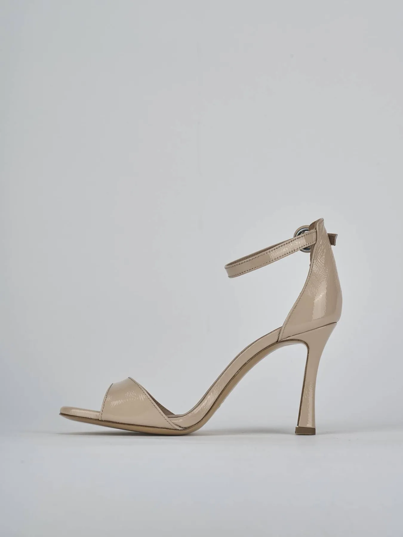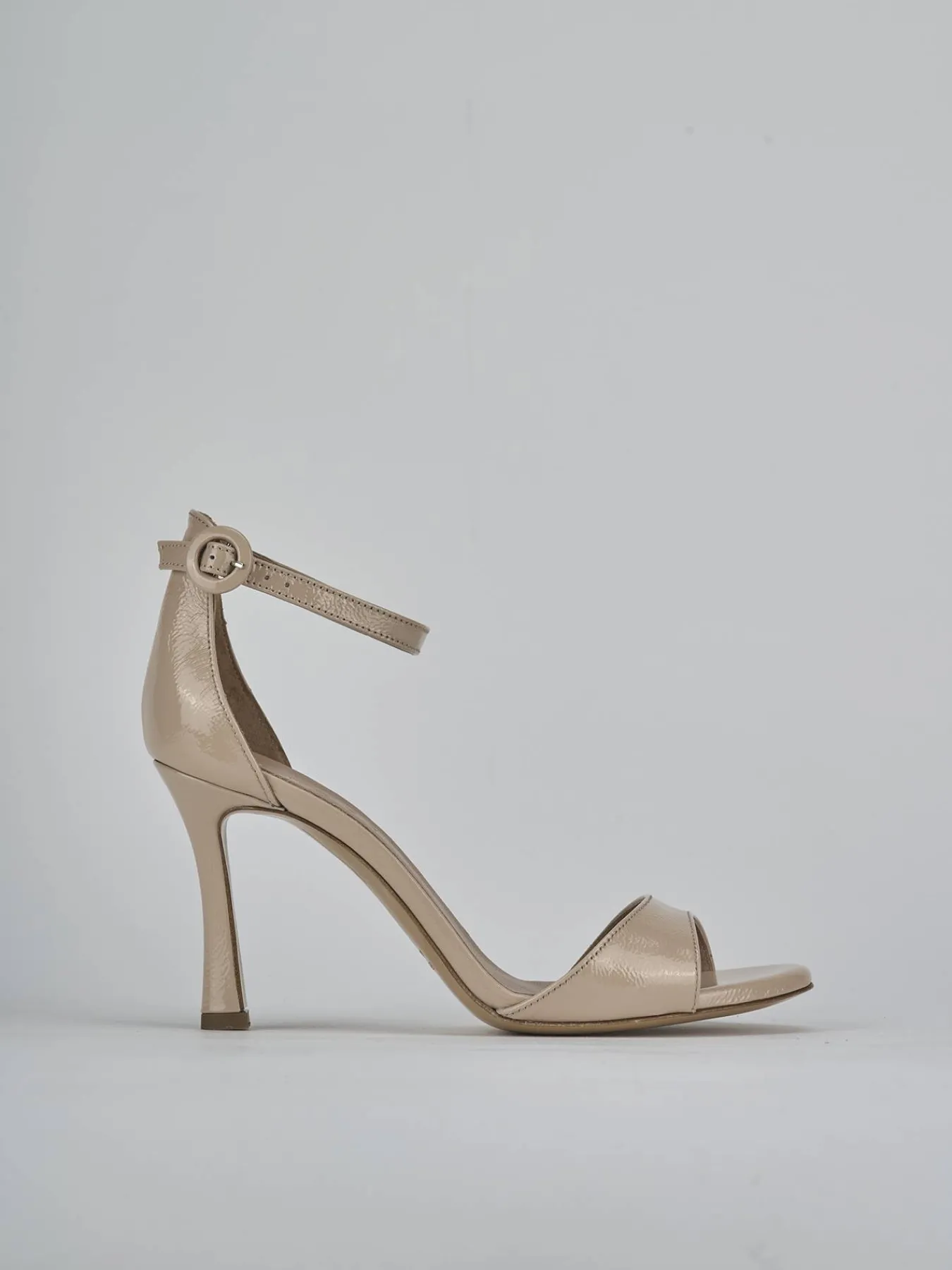 Sandalo tacco 9 cm fondo in cuoio e soletto interno in vera pelle. Tomaia in morbida pelle effetto verniciato, punta affusolata, fascia unica taglio svasato, cinturino in caviglia e tacco rocchetto. Perfetto per un’occasione speciale.