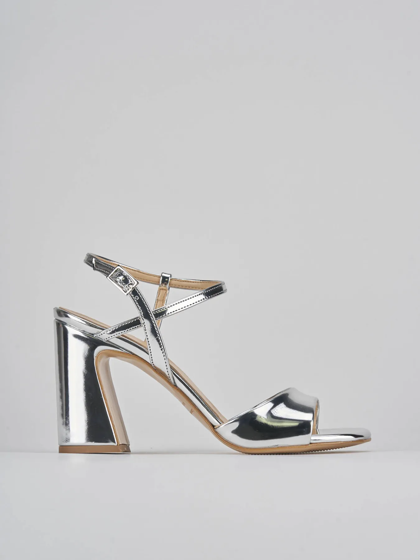 Sandalo tacco 7 cm, fondo in leggerissima gomma e soletto interno in vera pelle. Tomaia in morbida pelle effetto laminato, punta squadrata, fascia unica in punta , cinturino in caviglia con fibbia regolabile e tacco grosso per una camminta comoda, per un look chic.