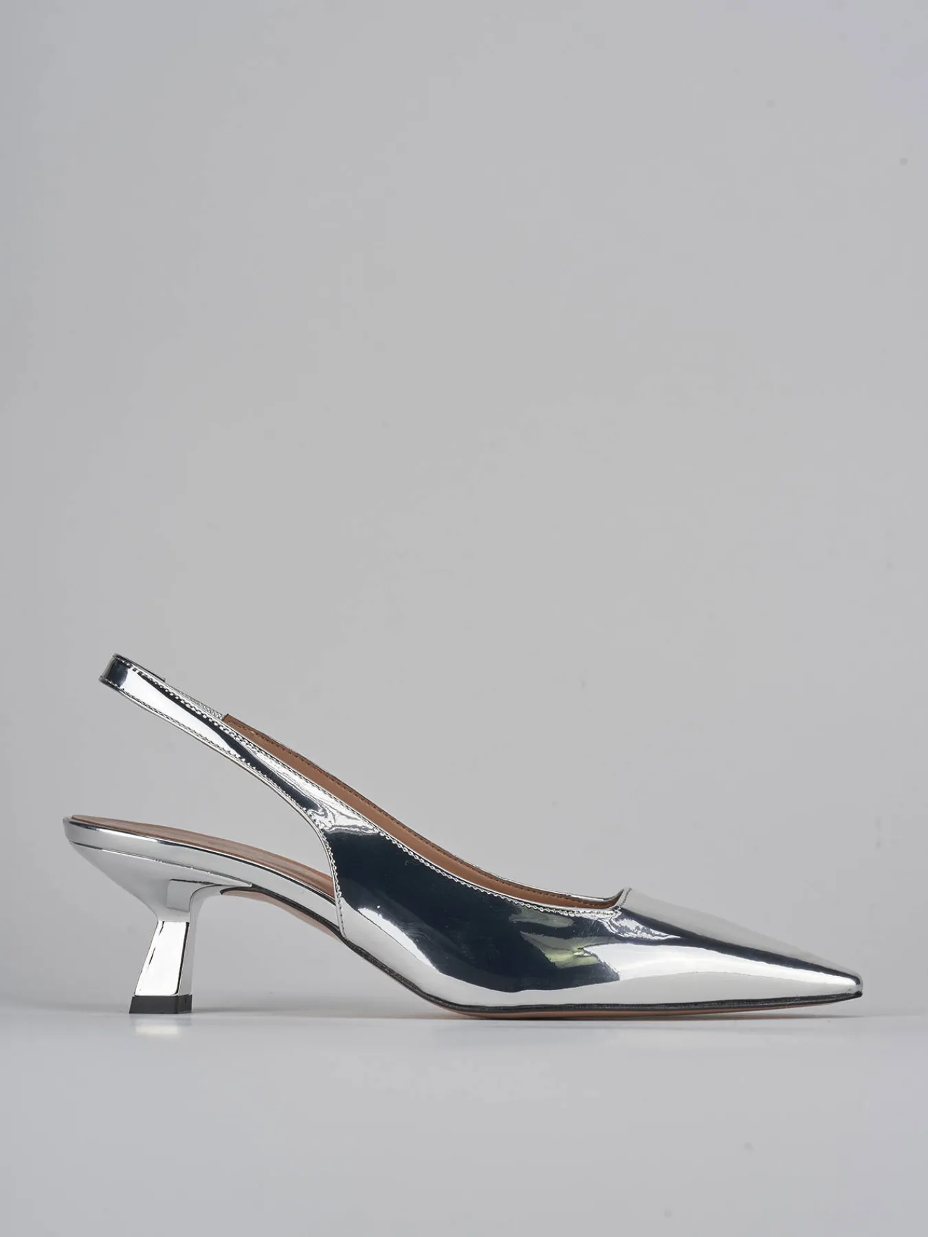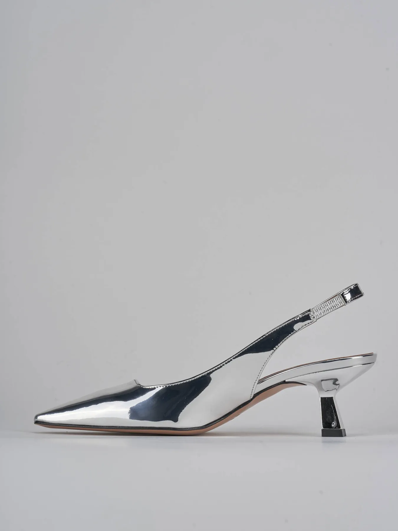 Slingback decolte’ tacco 5.5 cm fondo in cuoio e soletto interno in vera pelle. tomaia in morbida pelle effetto specchio, punta sfilata, scollo squadrato, cinturino elasticizzato per una calzata su misura. Nuovissimo tacco rocchetto per una maggiore stabilità. dal design versatile che dura nel tempo.