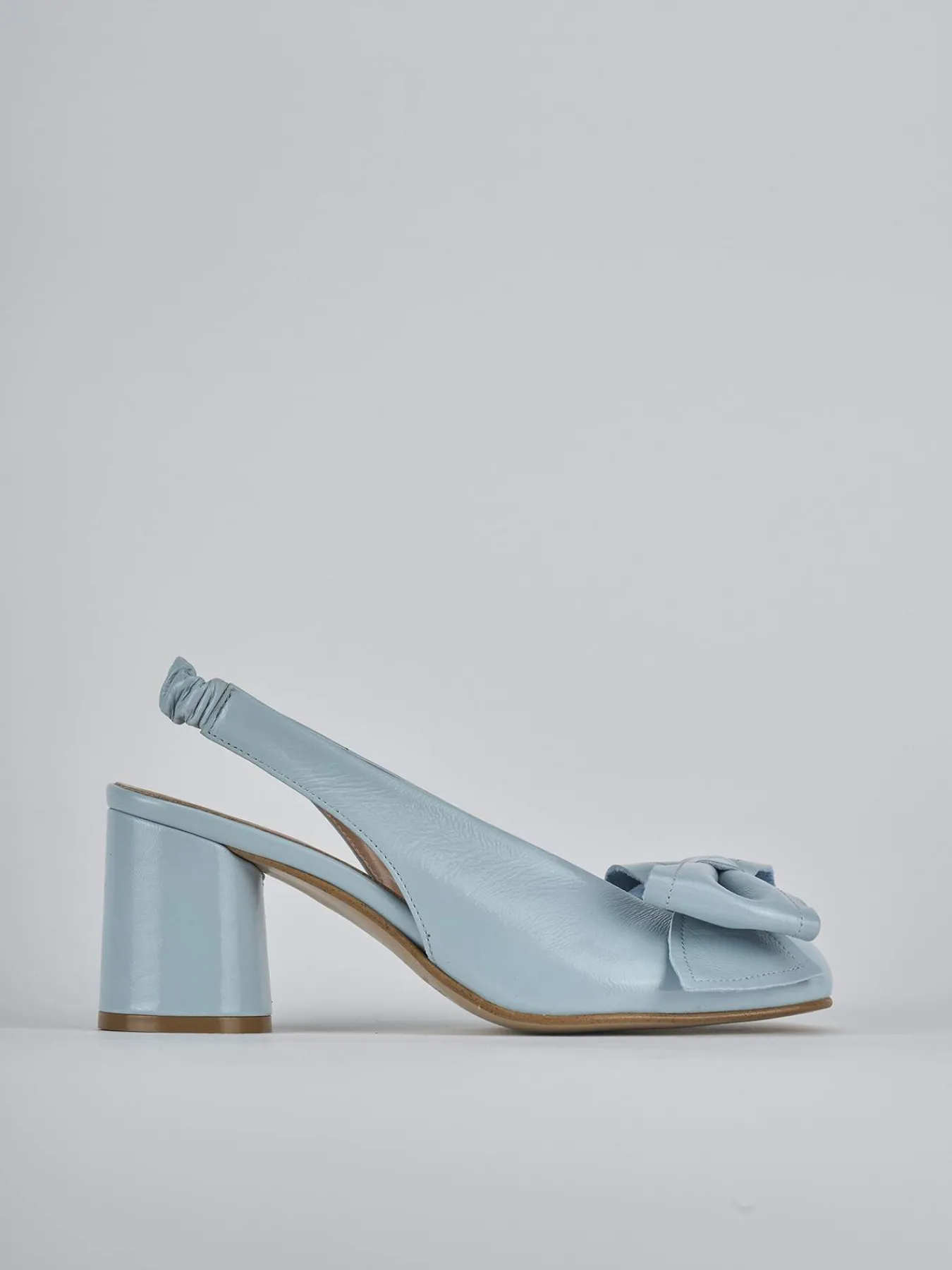 Slingback decolte’ tacco 8 cm fondo in leggerissima gomma e soletto interno in vera pelle. Tomaia in morbida pelle, punta affusolata, scollo a ‘U’, fiocco, cinturino elasticizzato morbido e tacco cilindrico. Dal design curato, che ti farà notare.