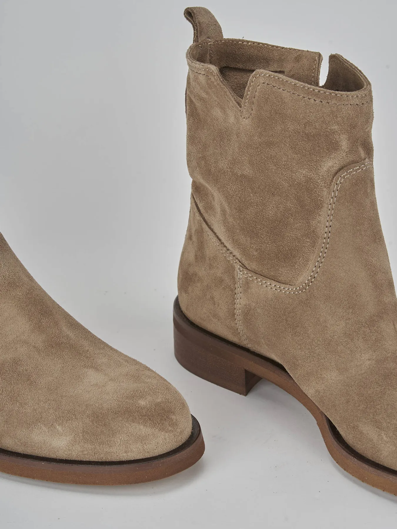Stivaletto tacco 2 cm fondo in leggerissima gomma e soletto interno in vera pelle. Tomaia in morbida pelle scamosciata, punta affusolata, cuciture a vista, piccolo scollo a ‘V’ sui lati e tacco solido. Modello passepartout per eccellenza, pensato per le attività di ogni giorno.