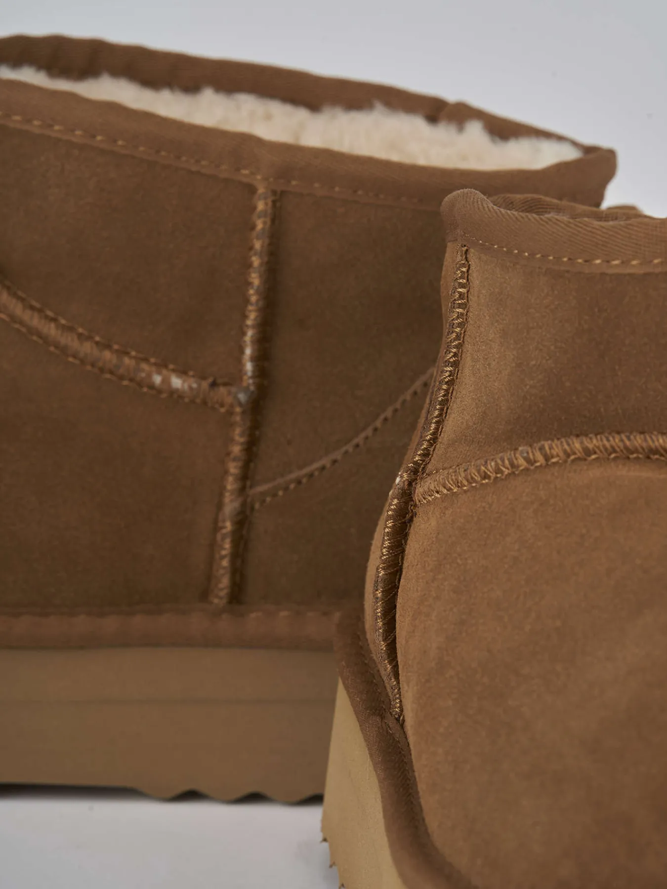 Stivaletto fondo in gomma e soletto interno in pelo. Tomaia in morbido camoscio, punta tonda, cuciture visibili, altezza gambale subito sopra alla caviglia e piccolo platform di 2 cm per un look casual cool perfetto. adatto con un paio di jeans vintage e un cappotto lungo.