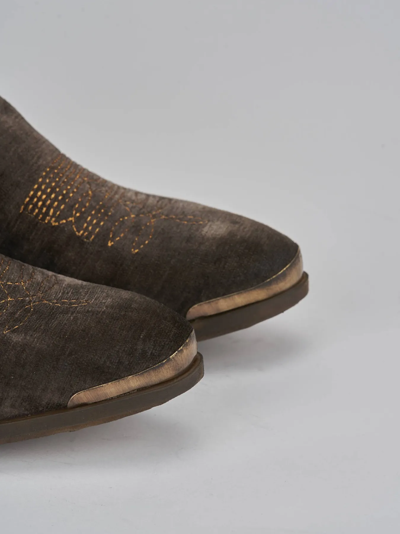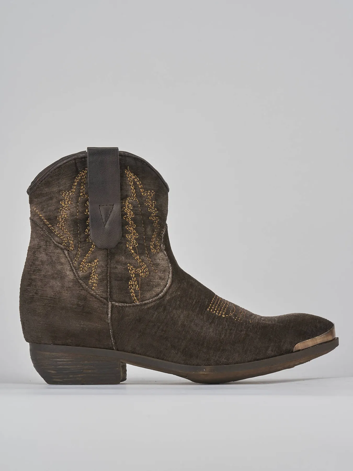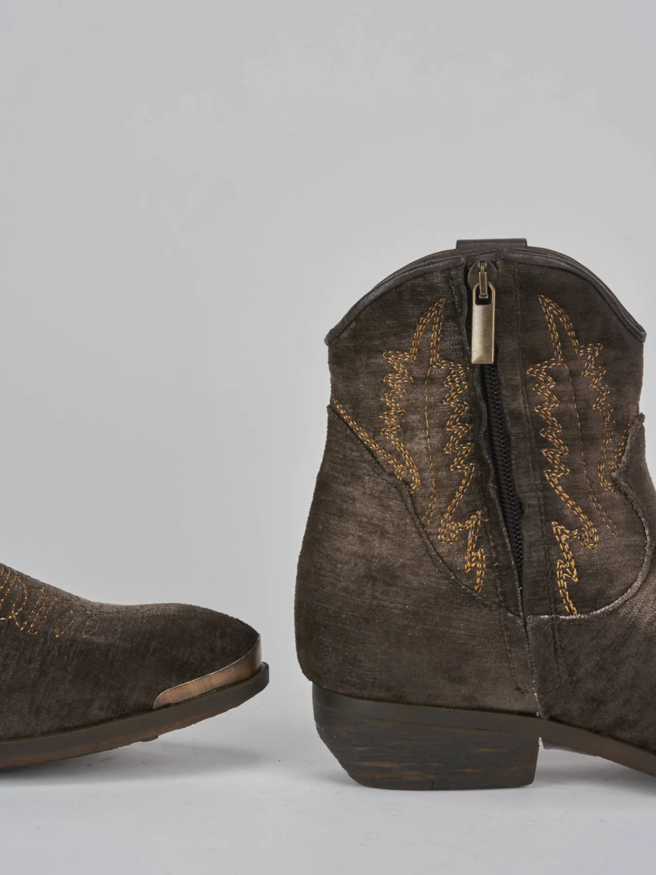 Stivaletto texano tacco 2 cm fondo in gomma e soletto interno in vera pelle. Tomaia in morbida pelle foderata in velluto, punta sfilata con puntalino in metallo aggiuntivo, cerniera laterale, ricami abbinati sul collo del piede e sul gambale per un look texano cool.