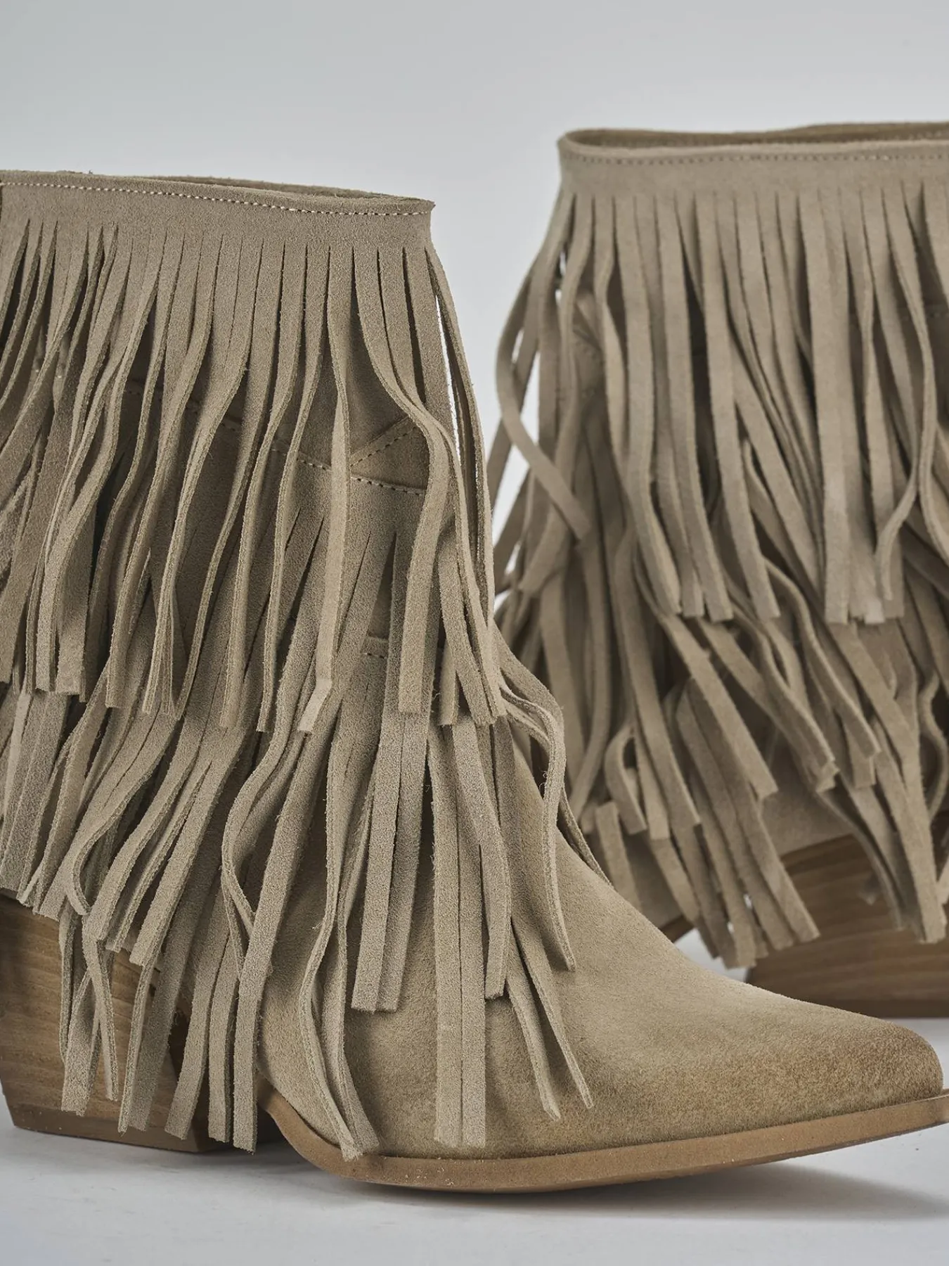 Stivaletto texano tacco 7 cm fondo in leggera gomma e soletto interno in vera pelle. Tomaia in morbido camoscio, punta sfilata, cuciture a mano, frange su entrambi i lati e tacco cubano. Guardolo leggermente sporgente. Perfetto per tutte le tue occasioni.