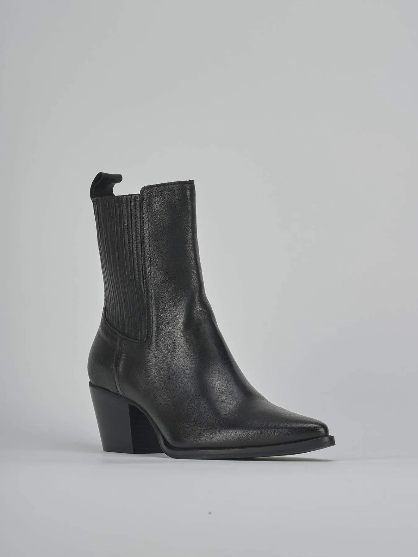 Stivaletto tacco 7 cm fondo in gomma e soletto interno in vera pelle. Tomaia in morbida pelle, punta sfilata, cuciture a mano visibili, lati elasticizzati in maniera cool e tacco stabile. Dalle linee semplici, perfetto con un paio di jeans e una maglia.