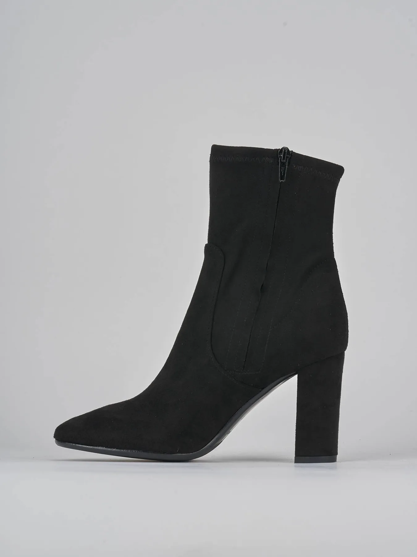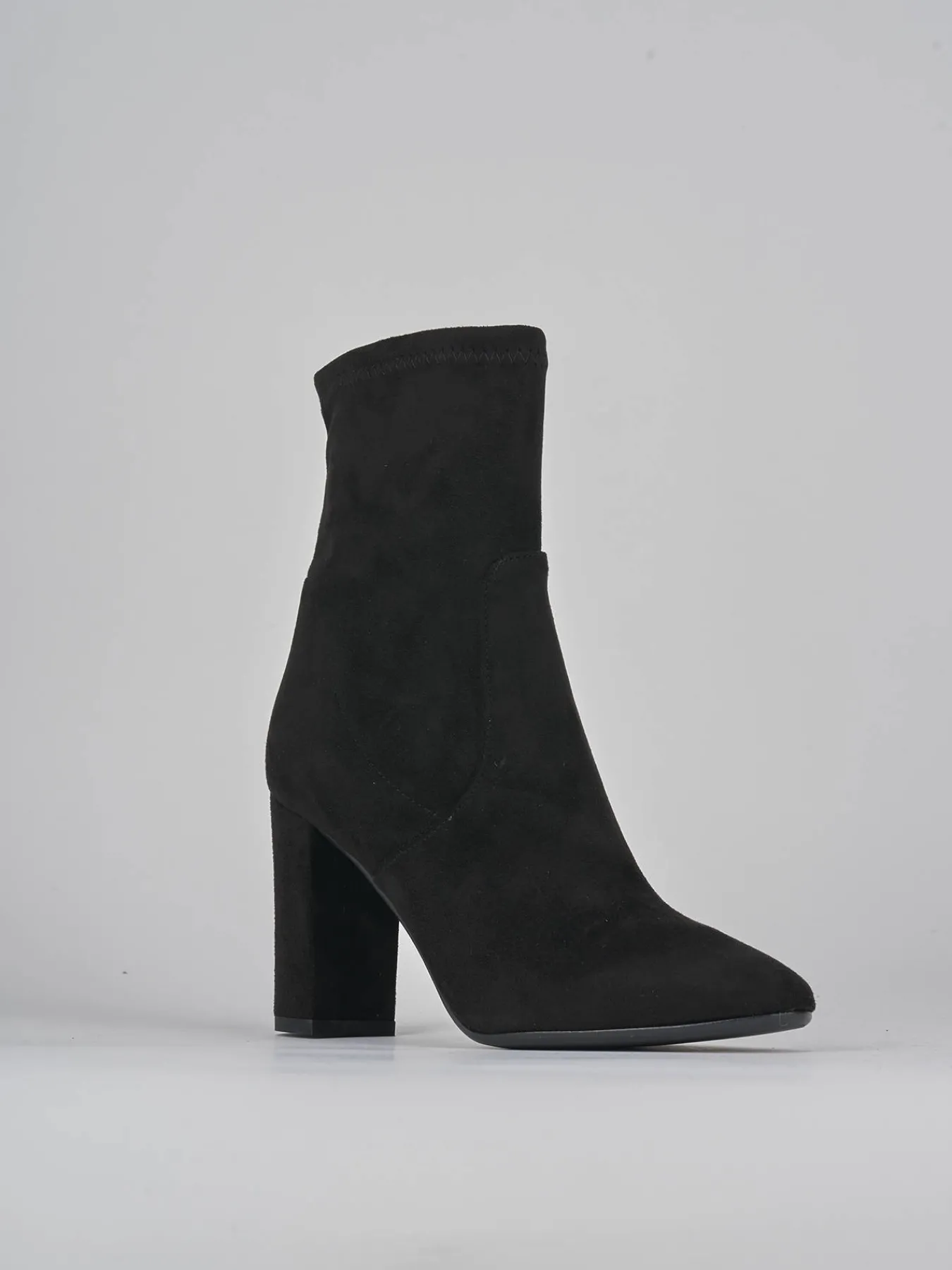 Stivaletto tacco 8.5 cm fondo in gomma e soletto interno in vera pelle. tomaia in morbido camoscio elasticizzato stretch che aderisce perfettamente al tuo piede. punta sfilata, cuciture a vista e tacco grosso per un look cool.