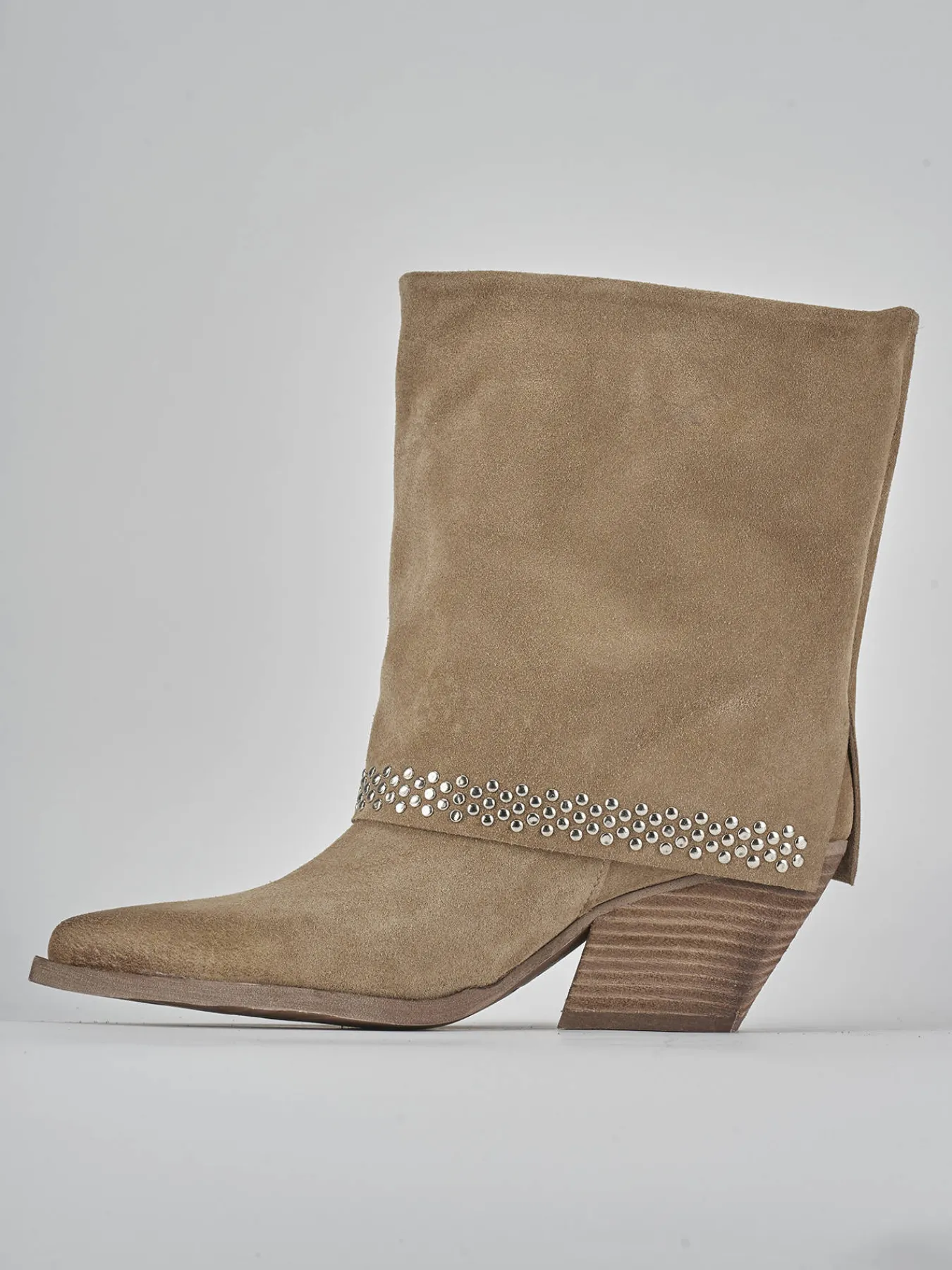 Stivale texano tacco 7 cm con fondo in leggera gomma e soletto interno in vera pelle. Tomaia in morbido camoscio, punta sfilata, gambale con risvolto che misura a metà polpaccio, borchie piccole, tacco cubano e guardolo sporgente per uno stile sempre chic.