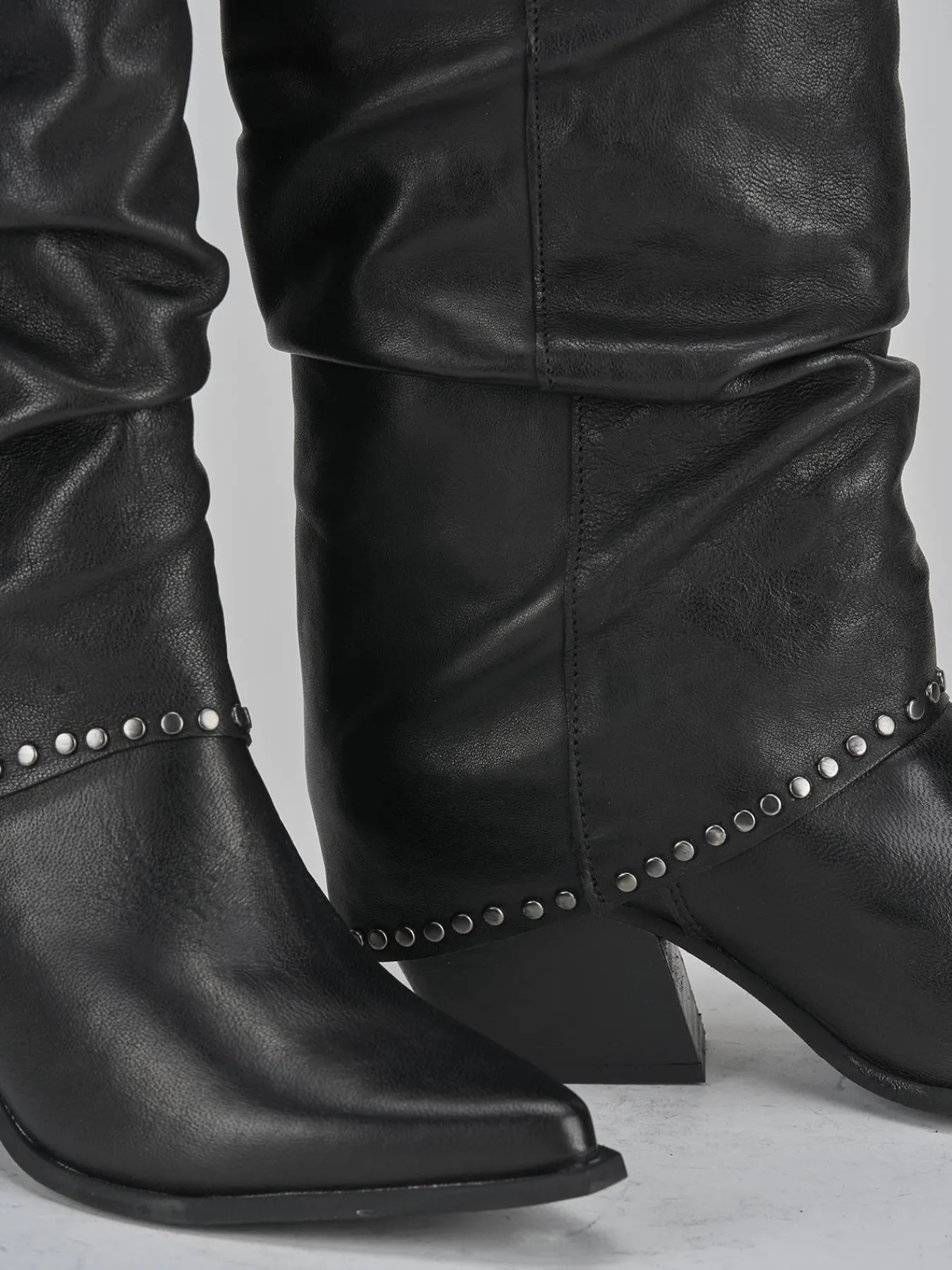 La punta sfilata e il risvolto aggiungono un tocco di raffinatezza, mentre le borchie e il guardolo sporgente donano un look cool e moderno.