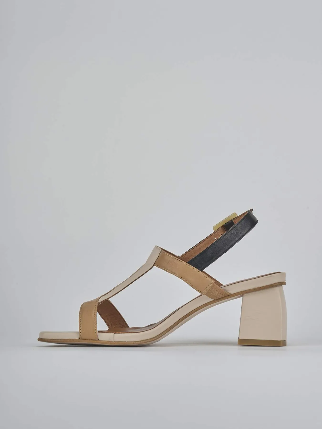 Sandalo tacco 5 cm fondo in leggerissima gomma e soletto interno in vera pelle. Tomaia in morbida pelle, punta squadrata, fascia a ‘T’ incrociata, cinturino con fibbia regolabile e tacco grosso stabile. Versatile sia per l’ufficio che per le occasioni speciali.