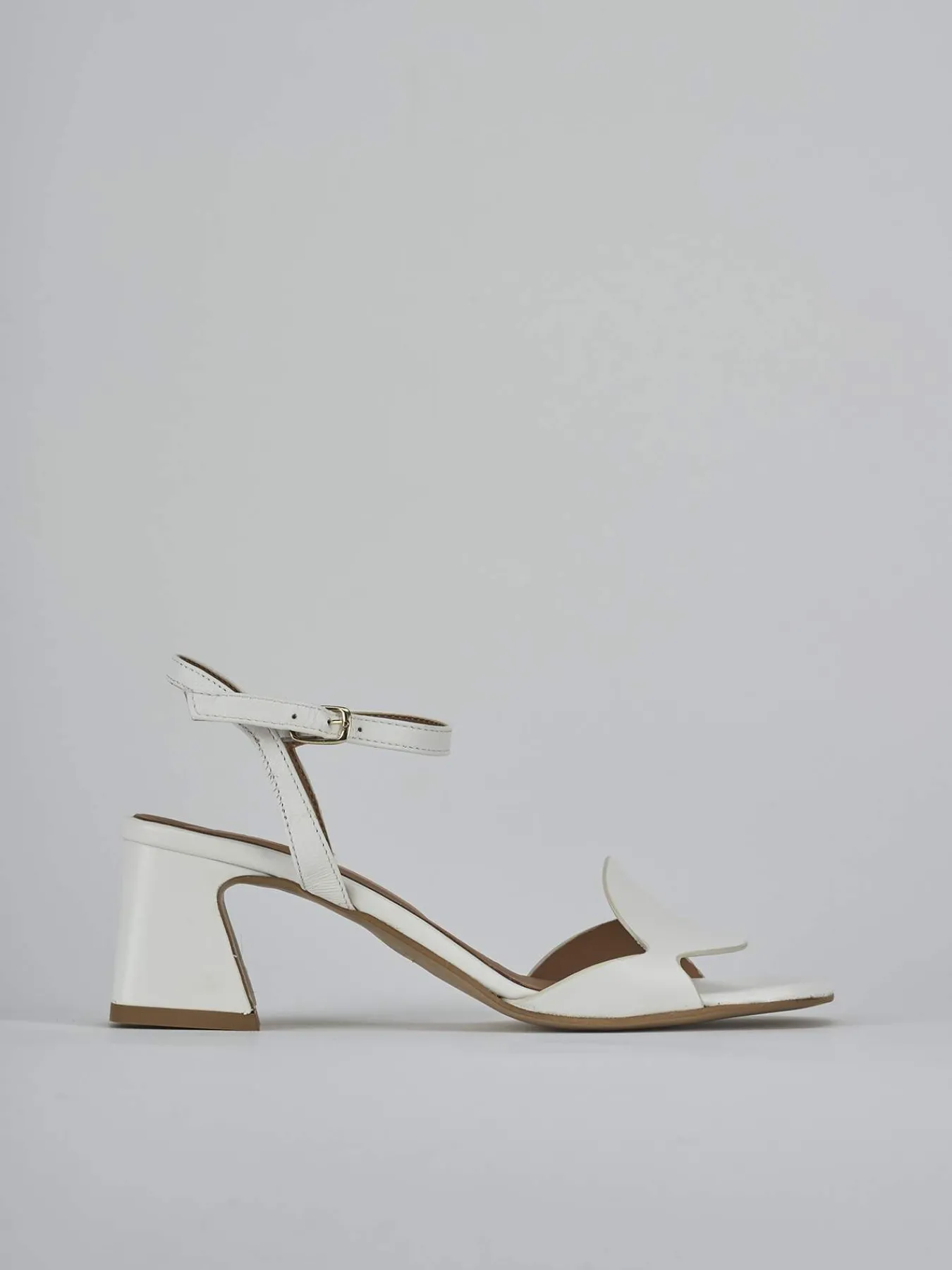 Sandalo tacco 5 cm fondo in leggerissima gomma e soletto interno in vera pelle. Tomaia in morbida pelle, punta squadrata, fascia unica con taglio geometrico, cinturino in caviglia con fibbia regolabile e tacco cool stabile. Perfetto con un vestito o una gonna.