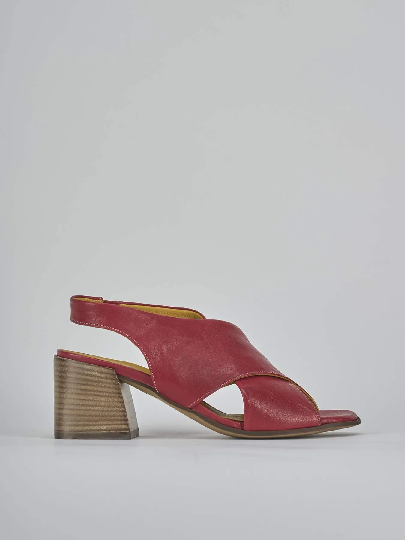 Sandalo tacco 6 cm fondo in cuoio e soletto interno in vera pelle. Tomaia in morbida pelle, punta squadrata, fasce incrociate, cinturino elasticizzato e tacco grosso per una camminata comoda. Adatte con una gonna o un vestito per un look cool.