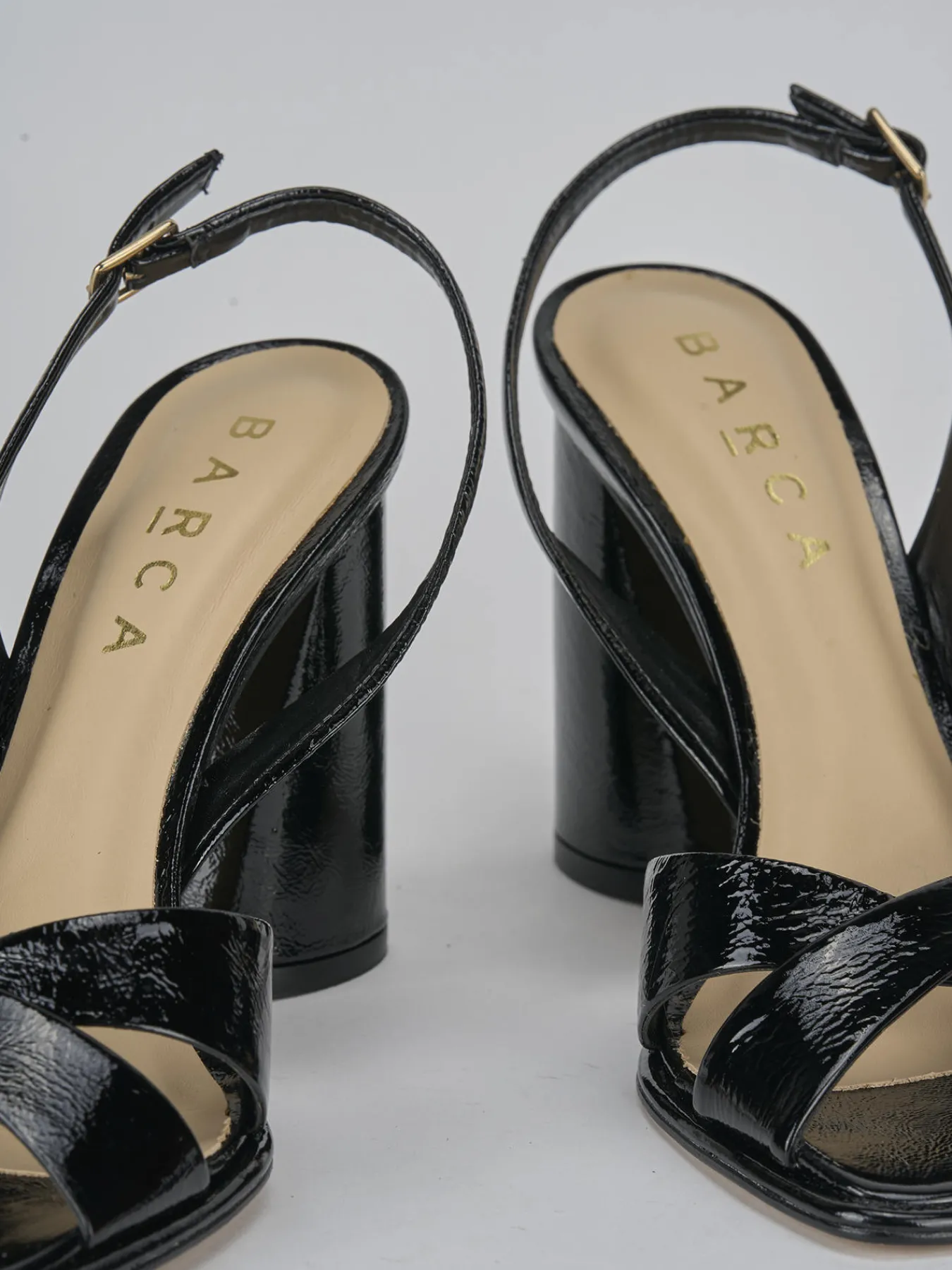 Sandalo tacco 9 cm fondo in leggerissima gomma e soletto interno in vera pelle. tomaia in morbida pelle effetto verniciato, punta squadrata, due fasce incrociate, cinturino con fibbia regolabile e tacco grosso a cono superchic. Perfetto per qualsiasi tua occasione.