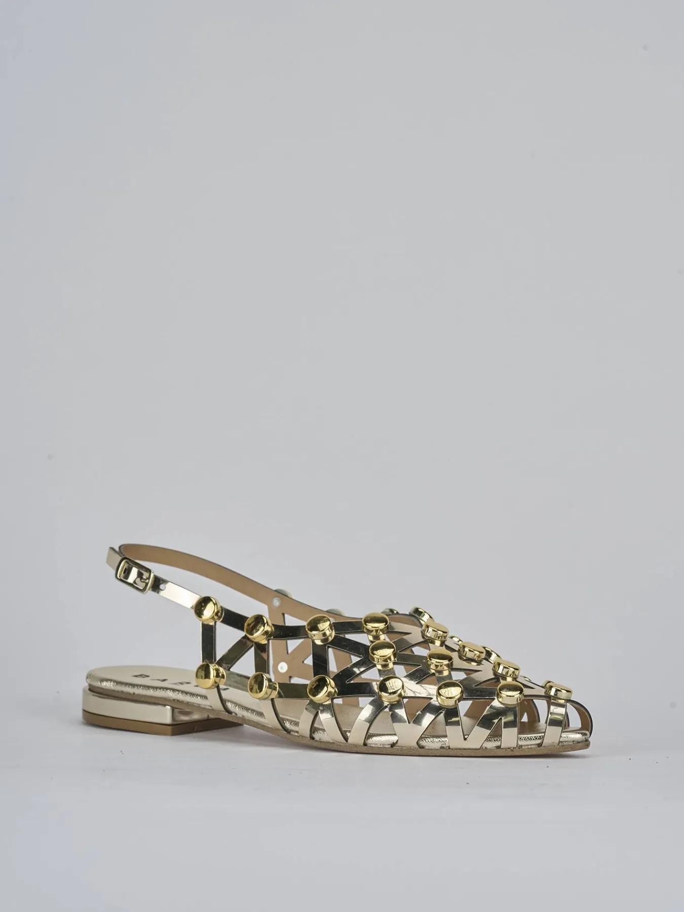 Sandalo tacco 2 cm, fondo in cuoio e soletto interno in vera pelle. Tomaia in morbida pelle effetto specchio, punta sfilata, ragnetto con borchie e cinturino con fibbia regolabile in caviglia. Per un look davvero cool.