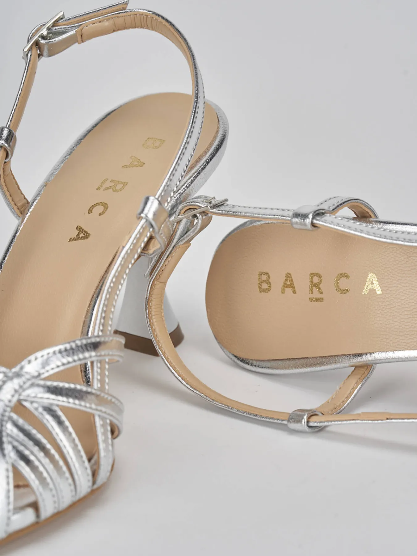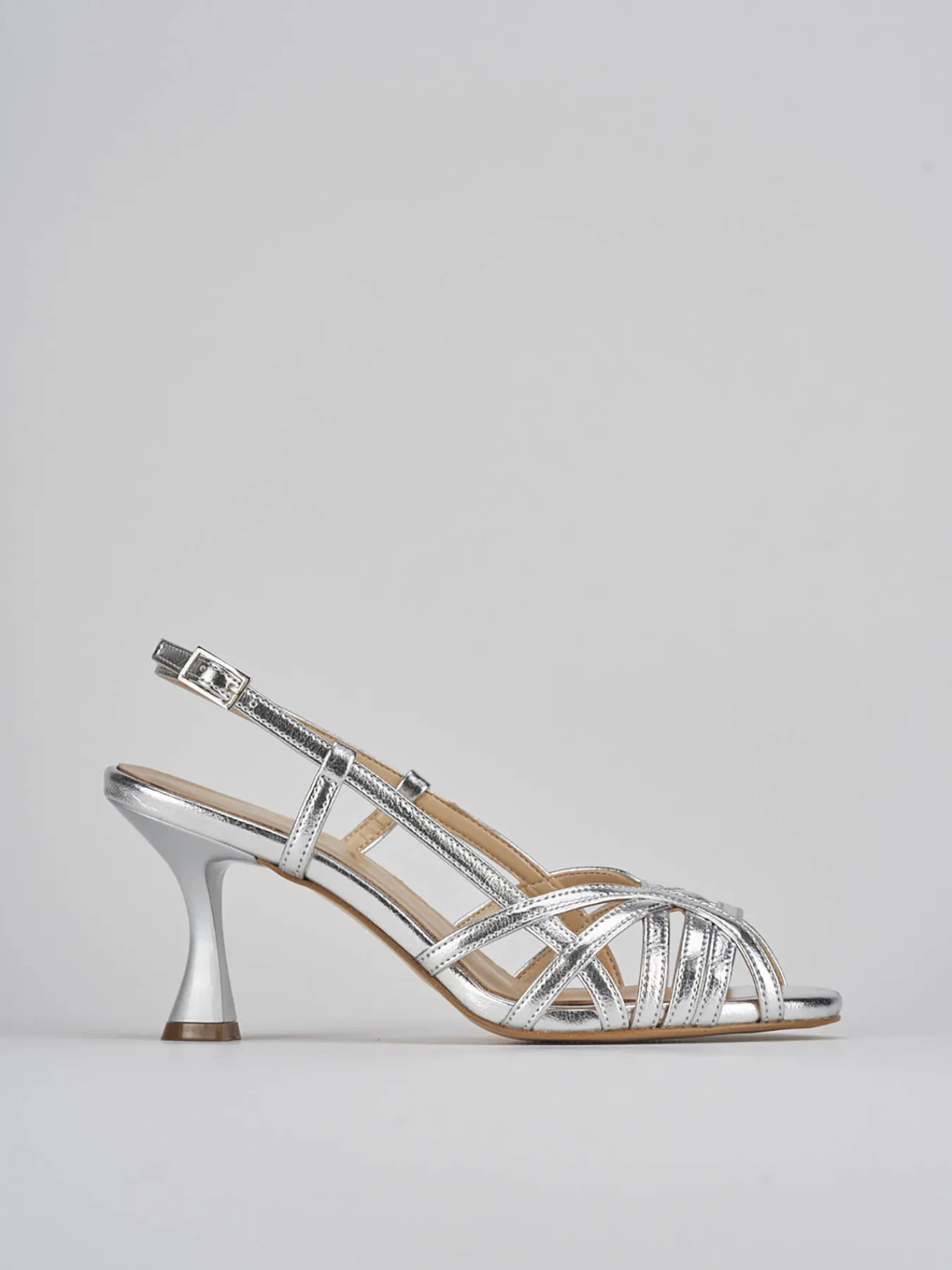 Sandalo tacco 7 cm, fondo in leggerissima gomma e soletto interno in vera pelle. Tomaia in morbida pelle effetto laminato, punta affusolata e fascia unica intrecciata in punta, cinturino che prende il collo del piede con chiusura una fibia regolabile e stabile tacco rocchetto.