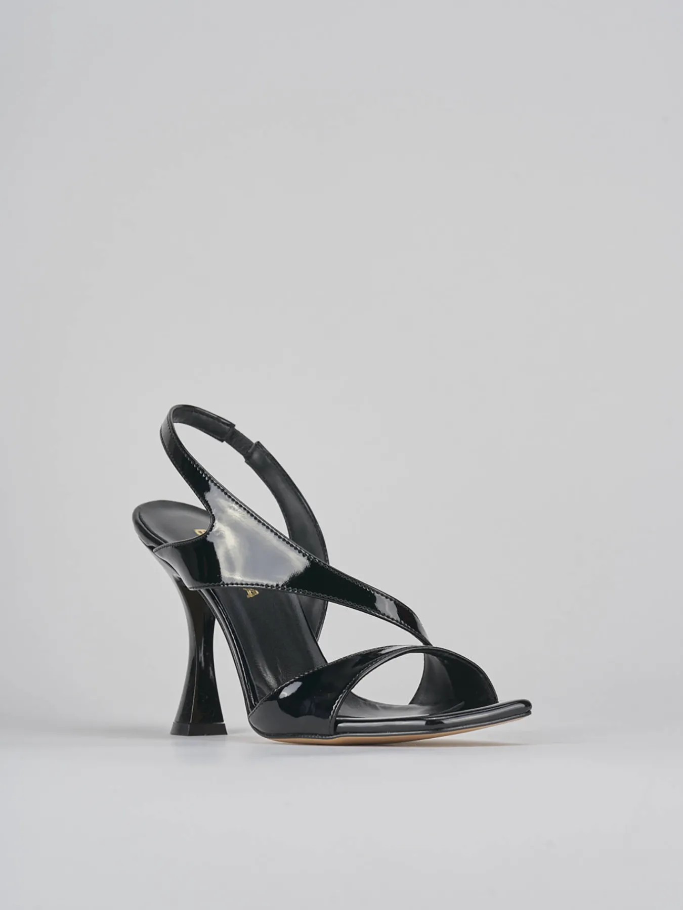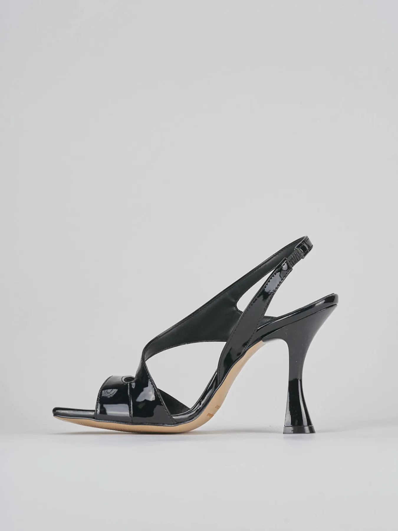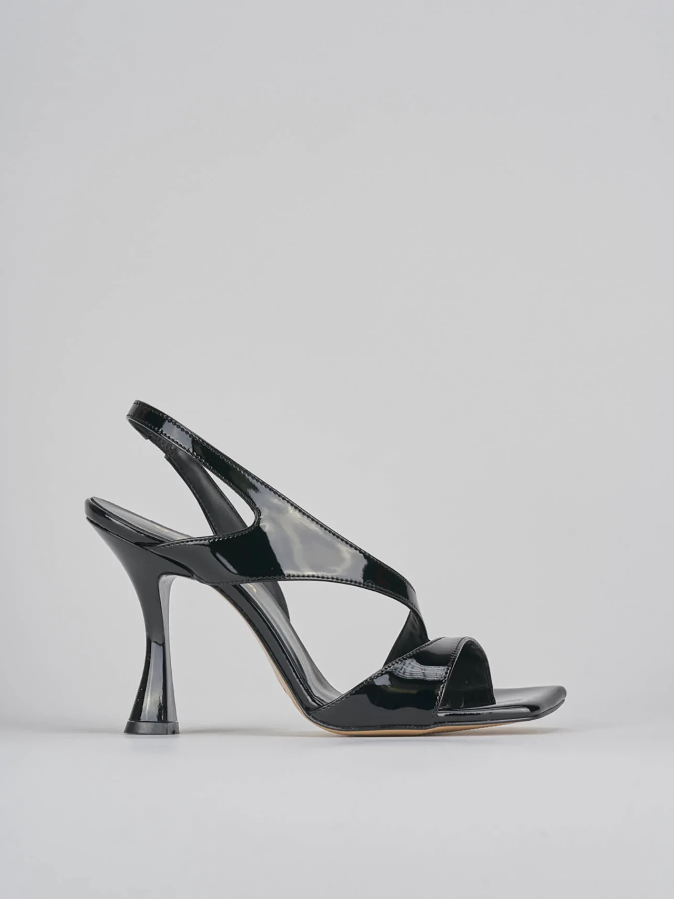Sandalo tacco 9 cm, fondo in leggerissima gomma e soletto interno in vera pelle. Tomaia in morbida pelle effetto verniciato, punta squadrata, fascia unica in punta, fibie e cinturino in caviglia regolabile, per un look glamour.