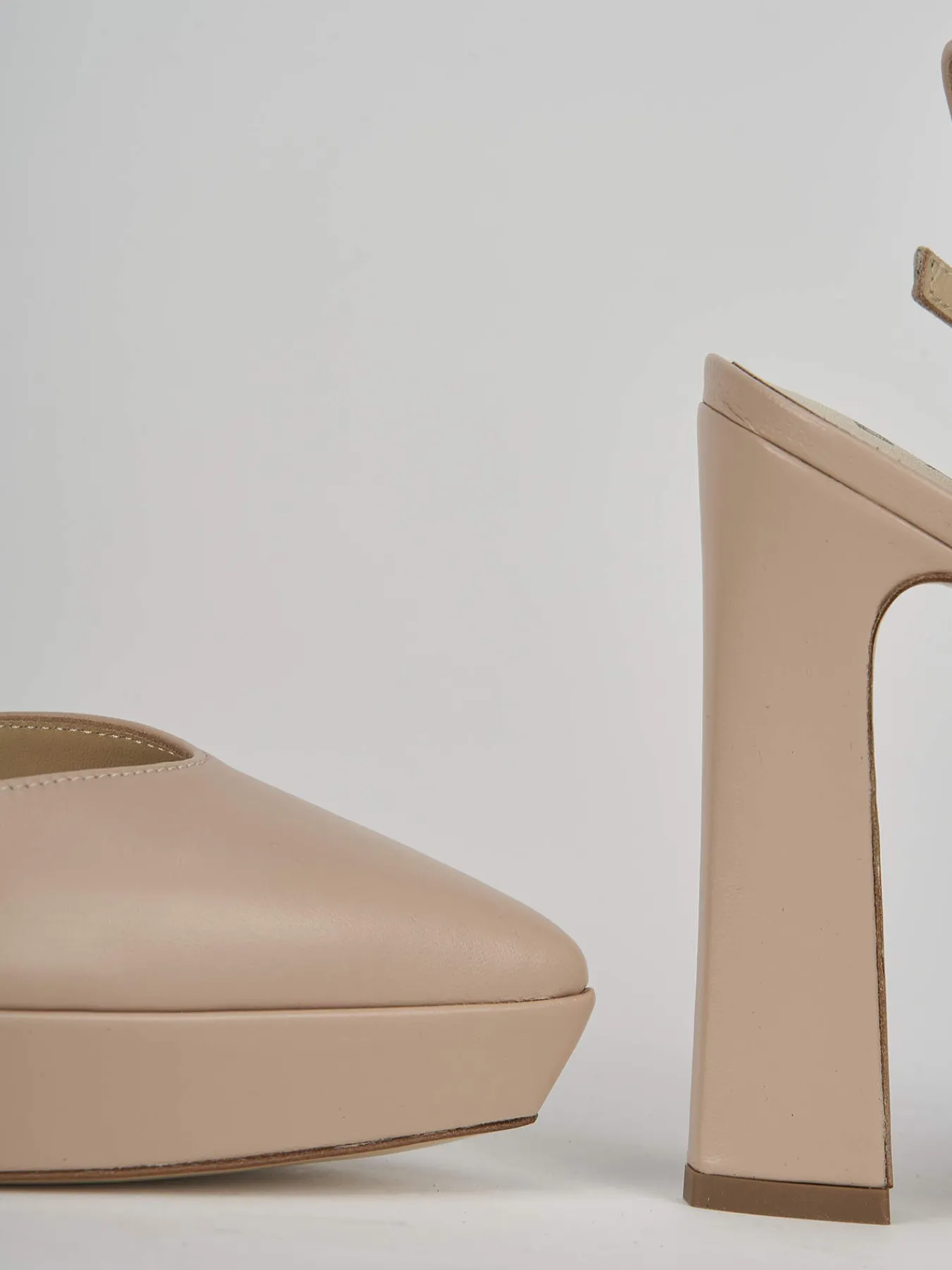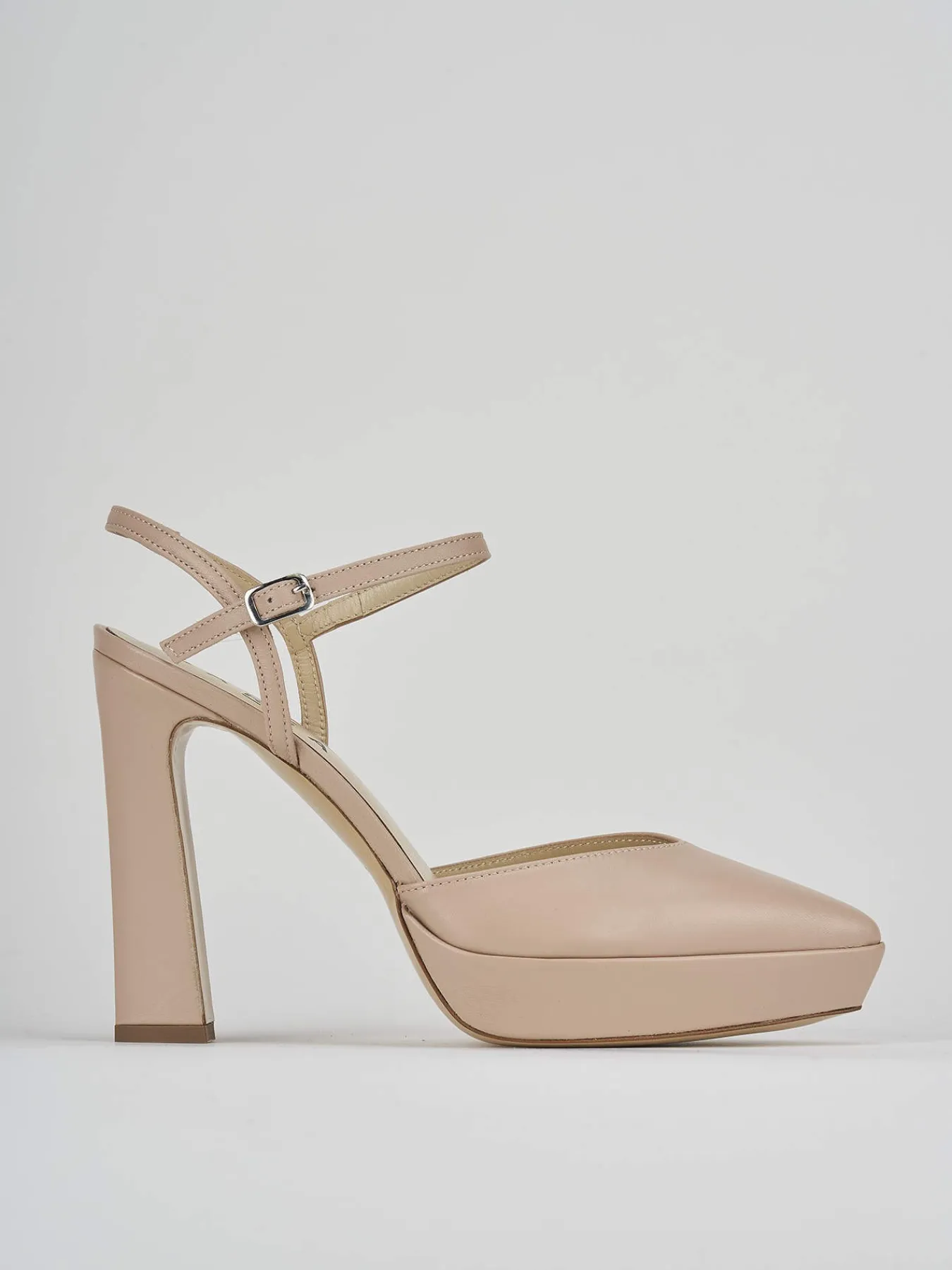 decolte tacco 11 cm fondo in cuoio e soletta interna in vera pelle. tomaia in morbida pelle nelle nuances nude, punta sfilata, cinturino in caviglia con fibbia regolabile, plateau 1 cm e tacco per un look cool.
