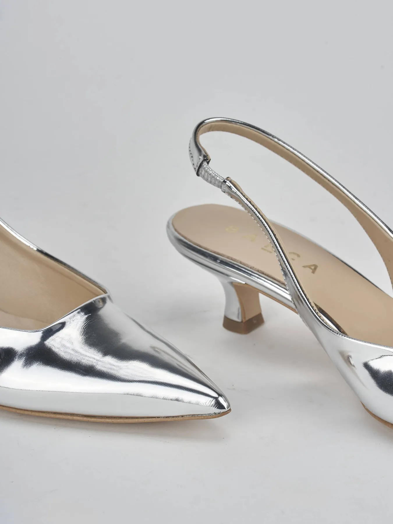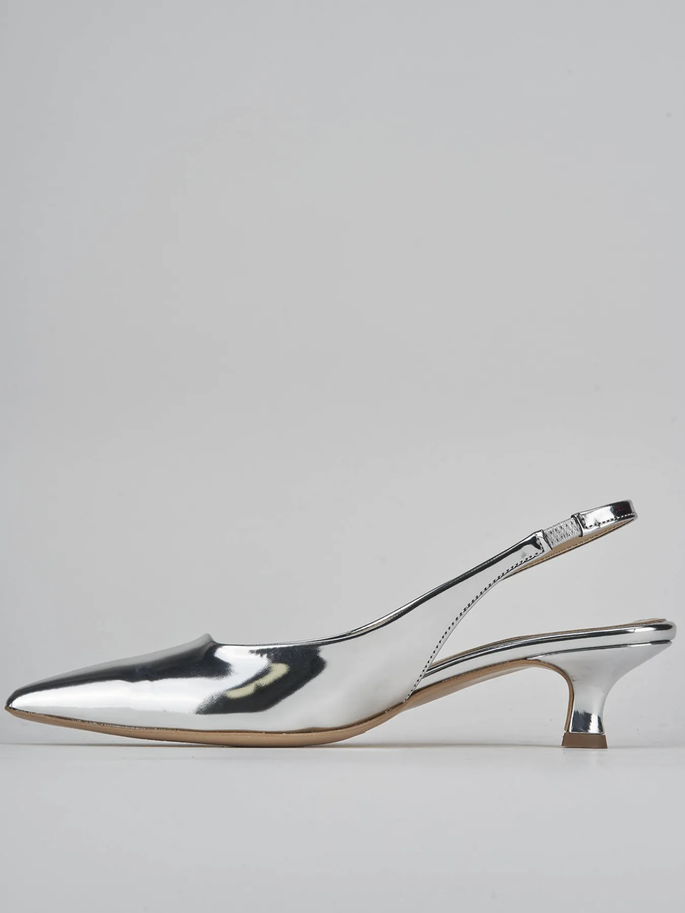 Slingback tacco 3 cm fondo in leggerissima gomma e soletto interno in vera pelle. tomaia in morbida pelle specchiata, punta sfilata, scollo squadrato, cinturino elasticizzato per il massimo del comfort e tacco rocchetto. perfetto e versatile con qualsiasi tuo outfit.