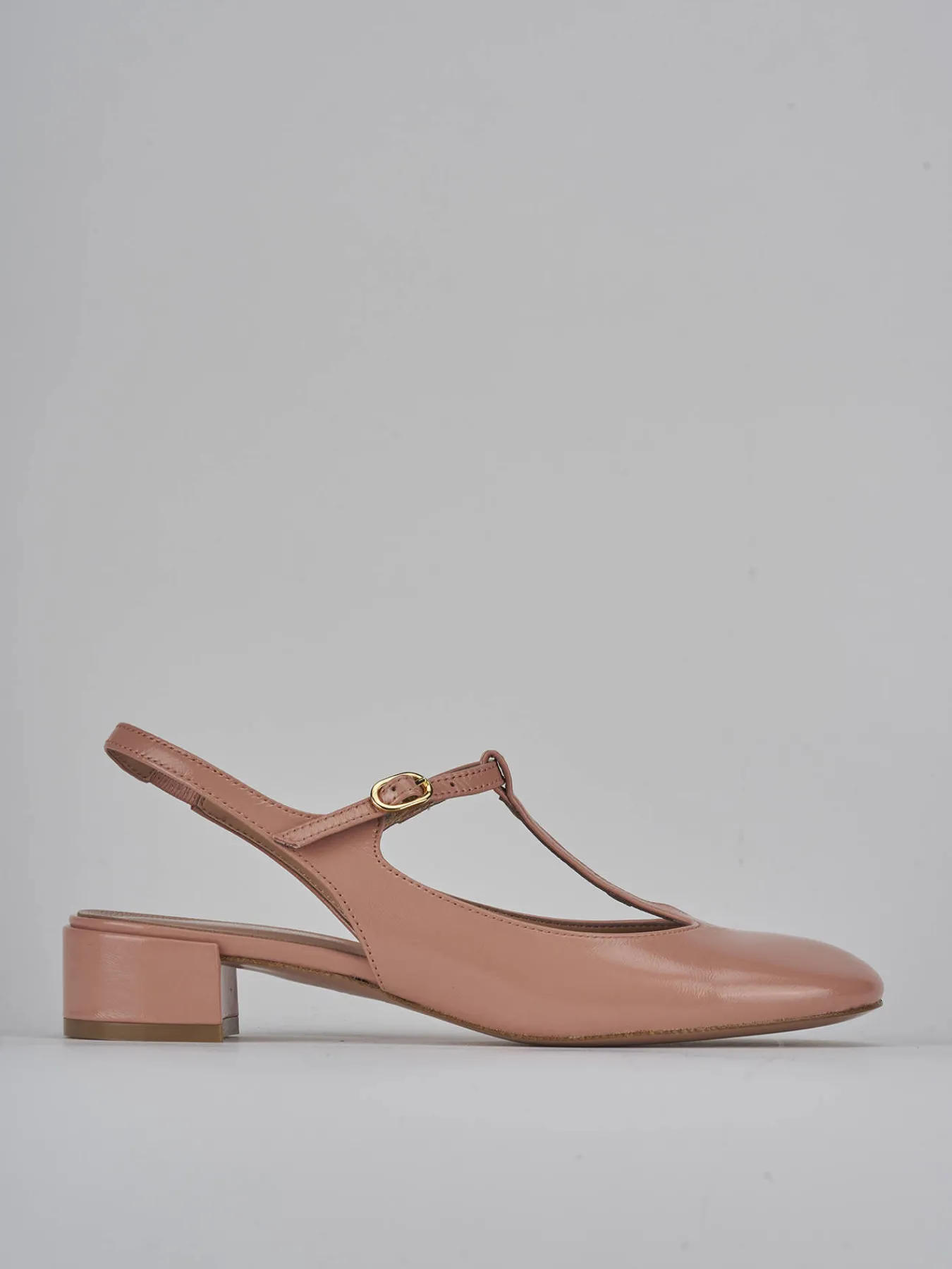 Slingback decolte’ tacco 3 cm fondo in cuoio e soletto interno in vera pelle. tomaia in morbida pelle effetto verniciato, punta tonda, cinturino a ‘T’ con fibbia regolabile e tacco comodo per un look chic.