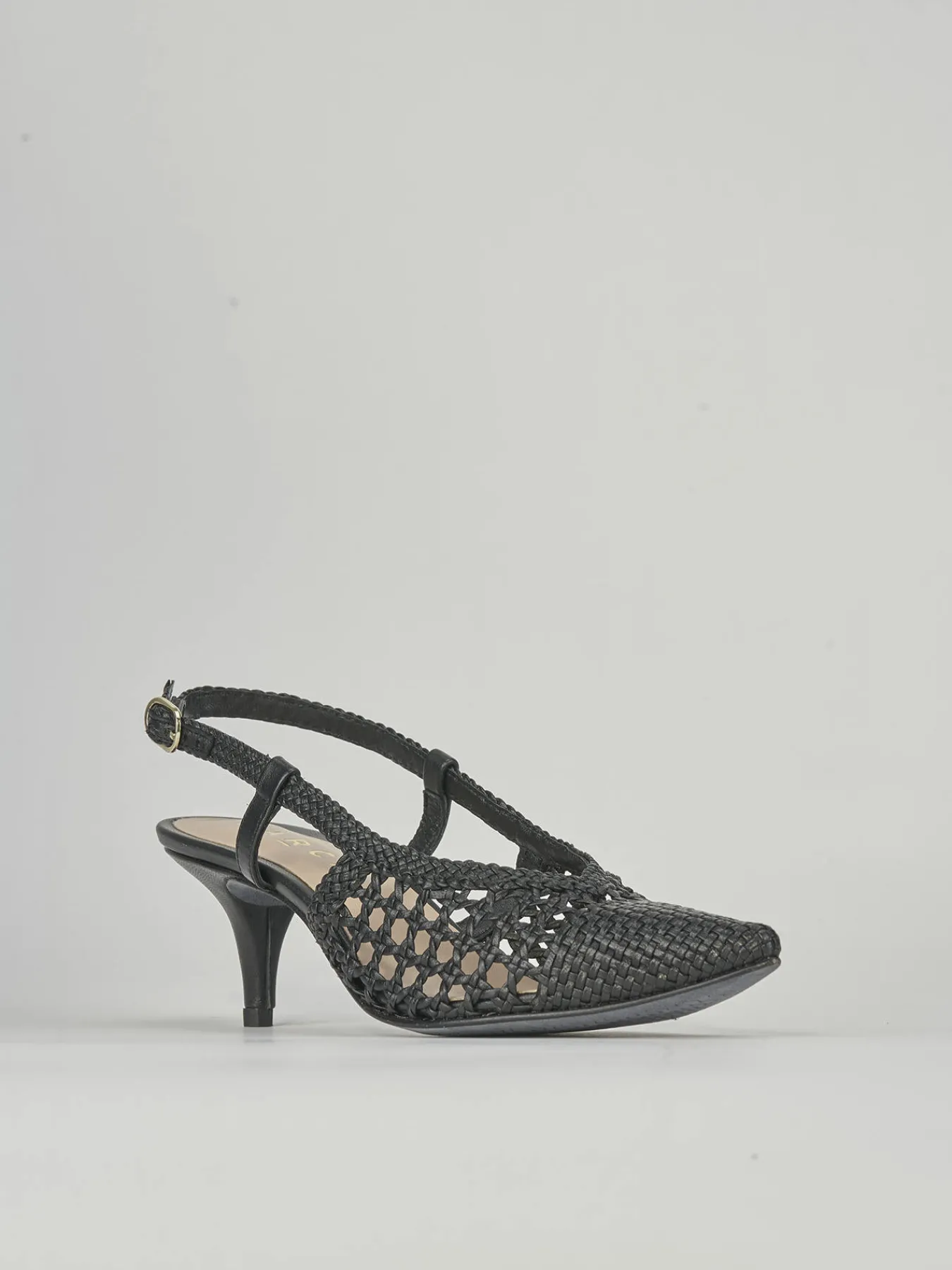 Slingback tacco 5.5 cm fondo in cuoio e soletto interno in vera pelle. Tomaia in morbida pelle finemente intrecciata, punta sfilata, scollo a ‘V’, cinturino con fibbia regolabile e tacco fino per un tocco glamour ai tuoi look.