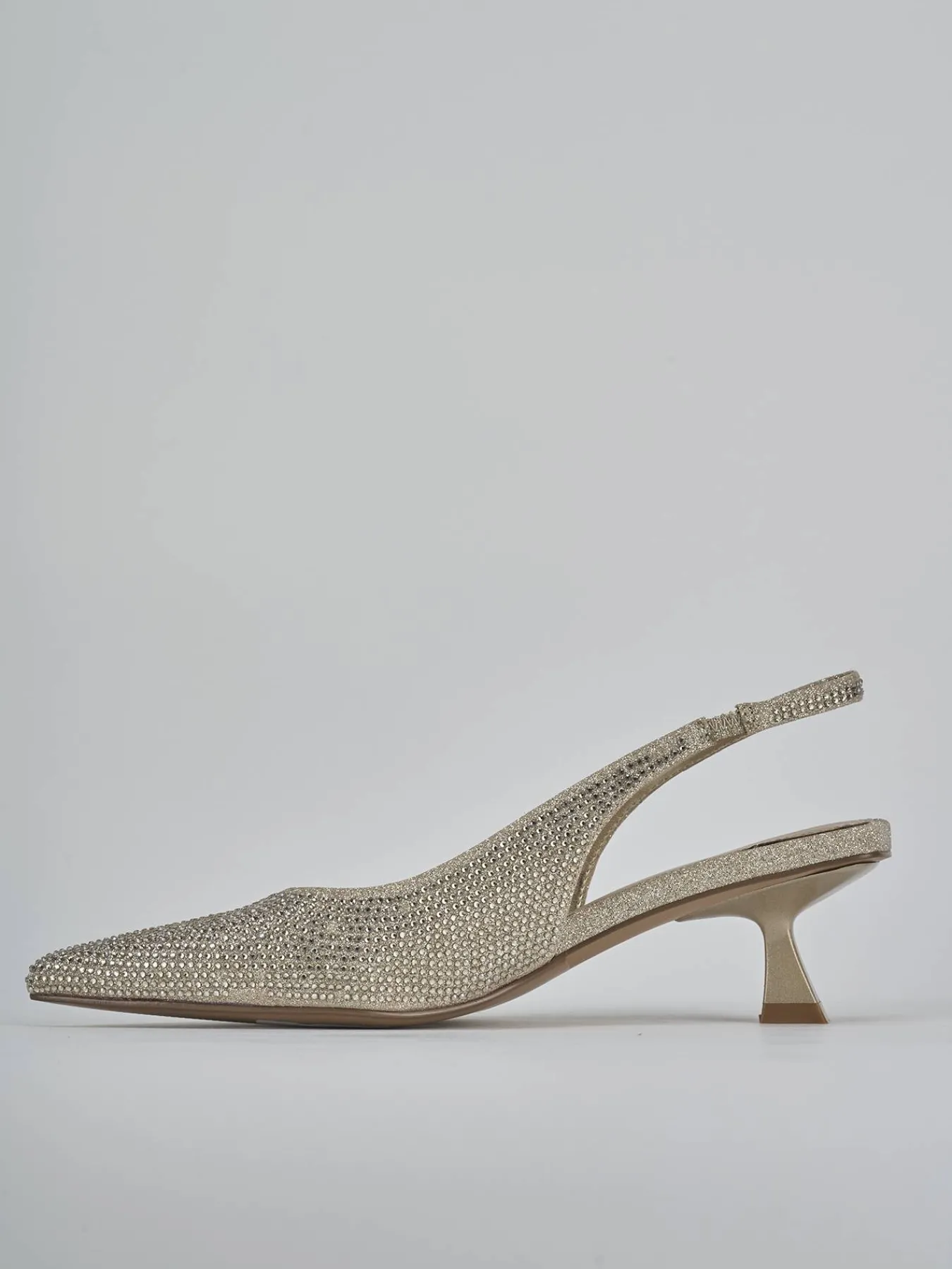 Slingback tacco 5 cm fondo in gomma e soletto interno in vera pelle. Tomaia in morbida pelle foderata in glietter, punta sfilata, scollo ampio a ‘U’, strass, cinturino leggermente elasticizzato e nuovissimo tacco rocchetto in materiale abs per un look cool.