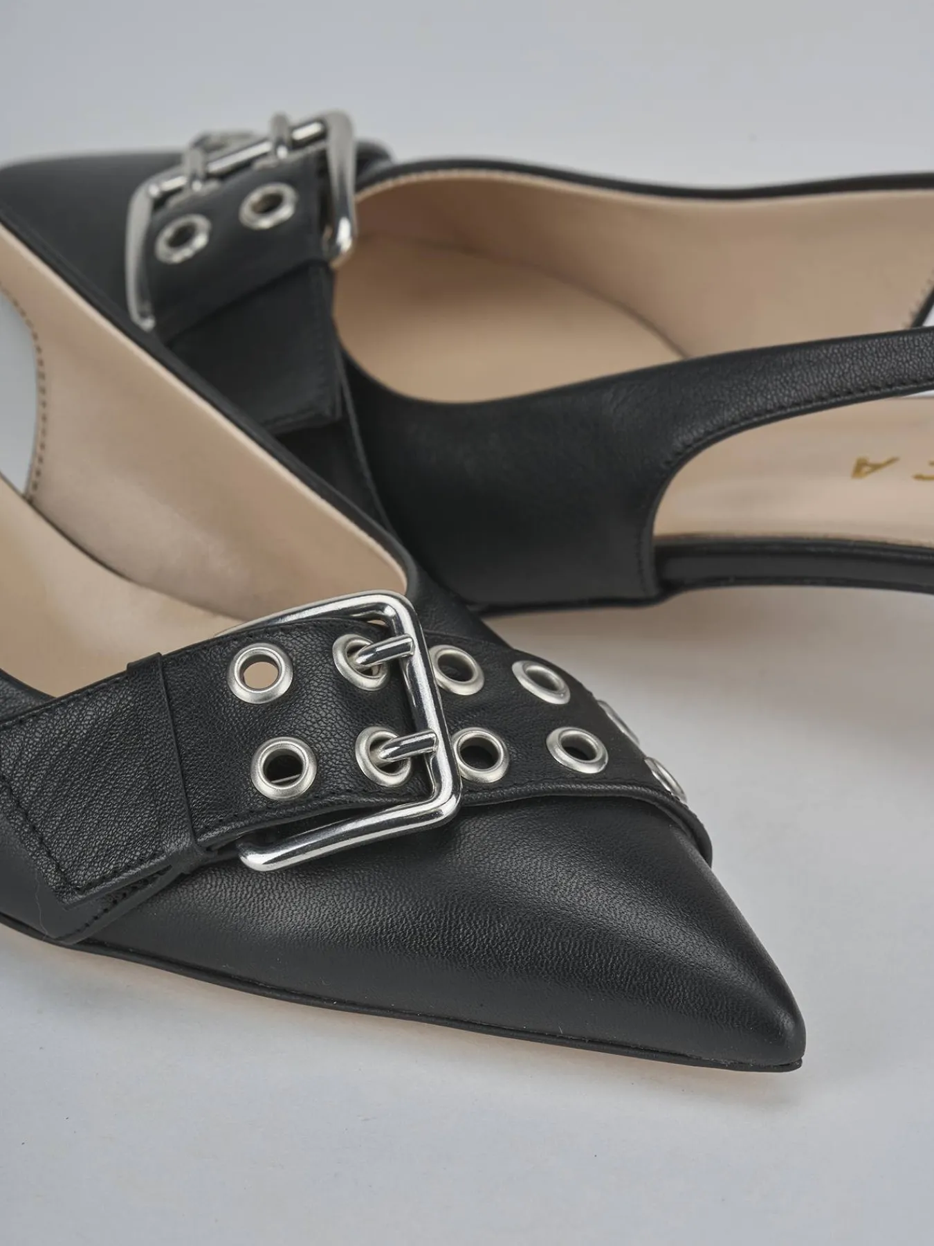 Slingback decolte’ tacco 4.5 cm fondo in leggerissima gomma e soletto interno in vera pelle. Tomaia in morbida pelle nappata, punta sfilata, scollo morbido a ‘U’, accessorio a fibbia con borchie forate, cinturino sottile con fibbia regolabile e tacco rocchetto per un look cool.