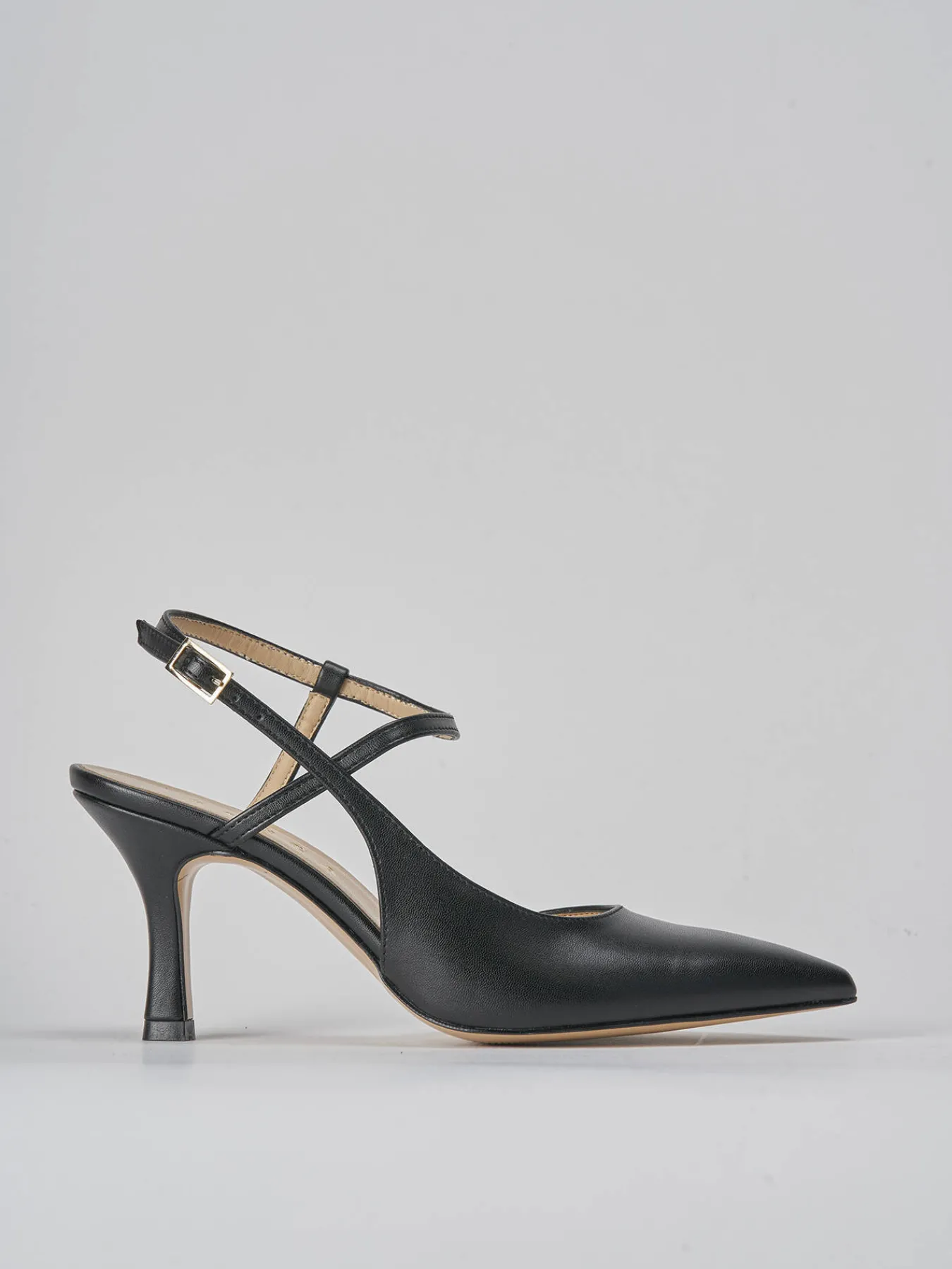 Slingback tacco 7 cm fondo in cuoio e soletto interno in vera pelle. tomaia in morbida pelle, punta sfilata, scollo leggermente squadrato, lato interno aperto, cinturino incrociato con fibbia regolabile e tacco rocchetto sottile. Dal design elegante, perfetto per le occasioni più speciali.