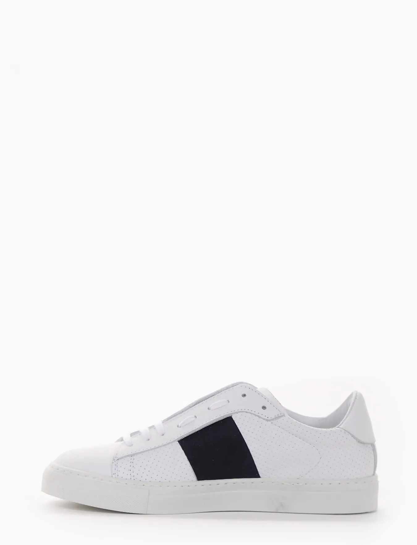 sneakers fondo in gomma e soletto interno in vera pelle. Tomaia in morbidissima pelle nappata, puntale liscio e microforatura laterale con applicazione di una fascia elastica color blu, ideale per il tuo tempo libero.