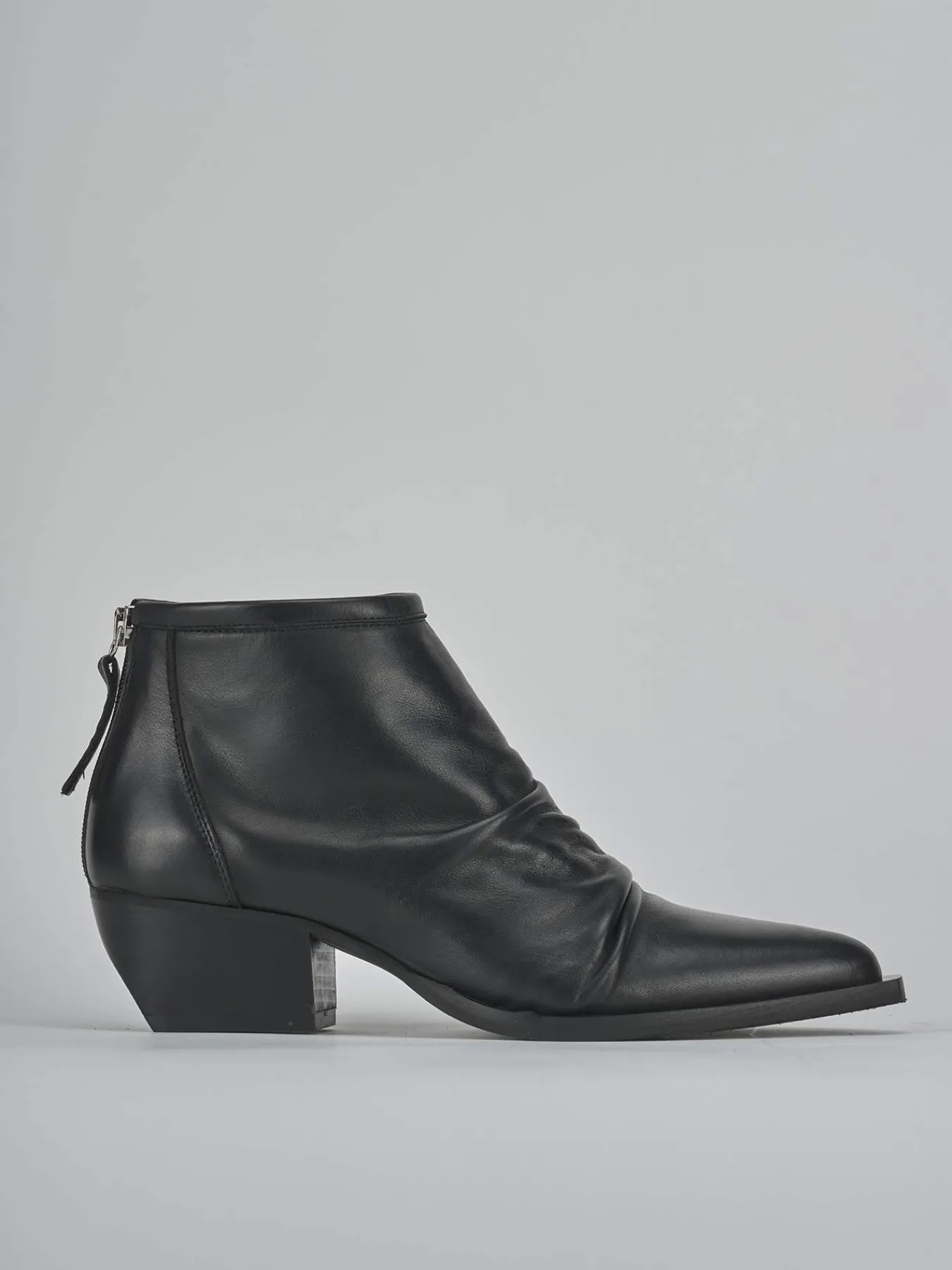Stivaletto texano tacco 5 cm fondo in gomma e soletto interno in vera pelle. Tomaia in morbida pelle, punta sfilata, cuciture a mano, arricciata sul davanti, comoda cerniera posteriore e tacco stabile. Perfetto con un paio di jeans e una maglia.
