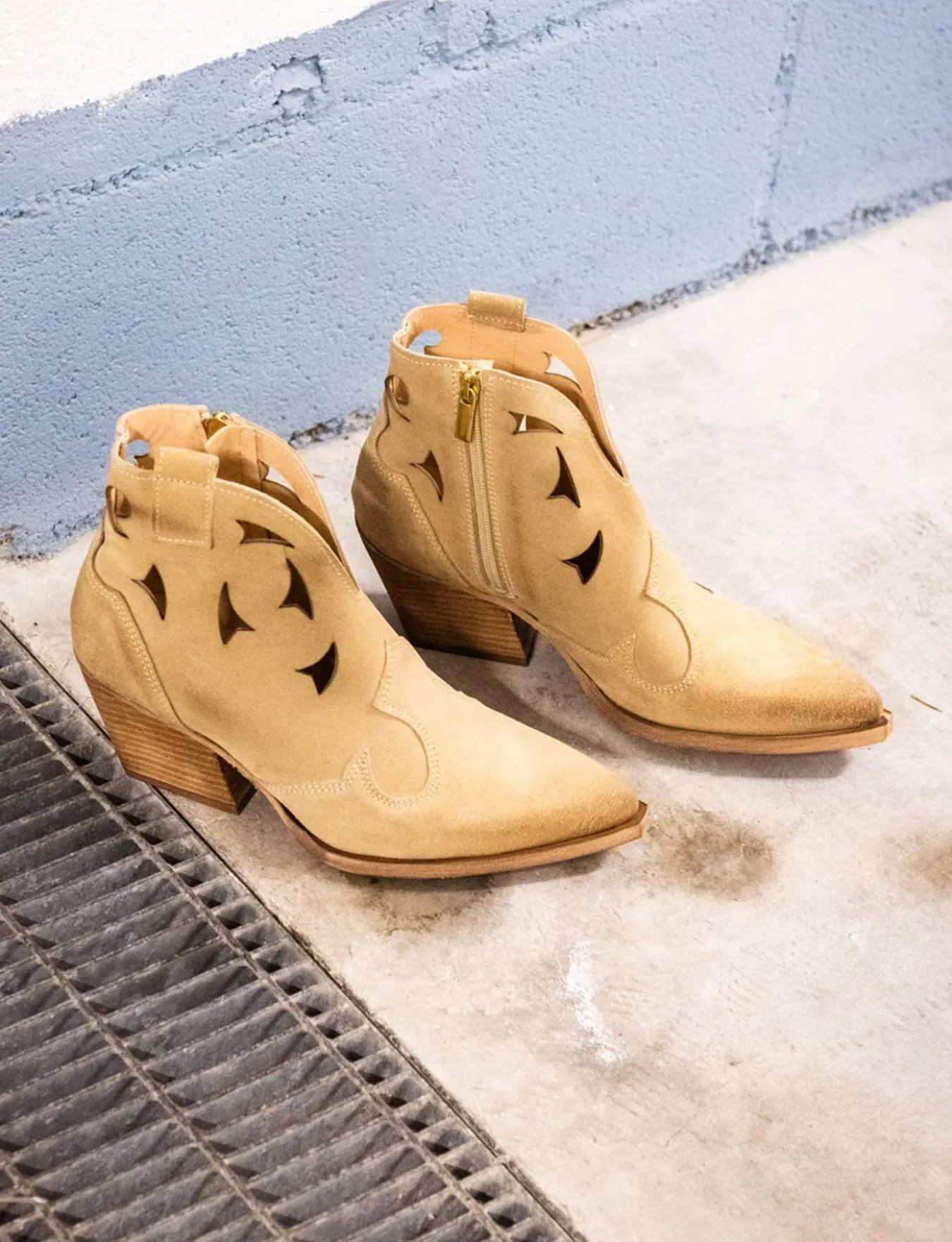 Stivaletto texano 5.5 cm fondo in gomma e soletto interno in vera pelle. Tomaia in morbida pelle scamosciata, punta sfilata, ghette, cuciture in rilievo, laserato, rapida chiusura con cerniera laterale e tacco cubano. Dal design ricercato, versatile con ogni tuo look.